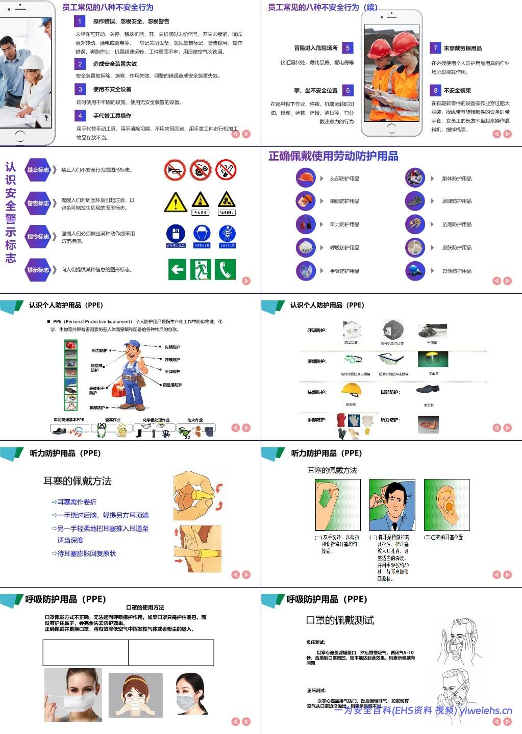 重点演示了安全帽、防尘口罩、耳塞等的正确佩戴方法及测试方式(如正/负压测试)。
