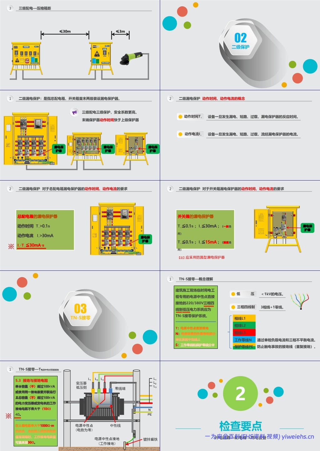 总配电箱:动作电流 I△ >30mA,动作时间 T△ >0.1s,且 I△·T△ ≤30mA·s;