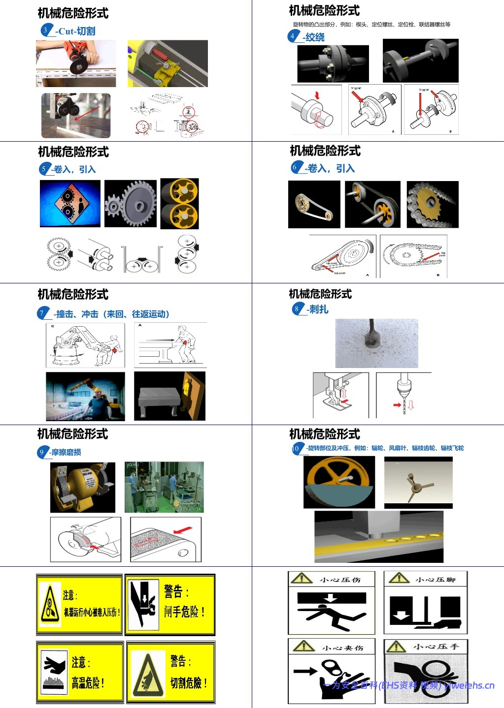 同时指出,机械伤害常见形式包括:挤压、剪切、切割、缠绕、卷入、冲击、刺穿、摩擦、高压流体喷射等。
