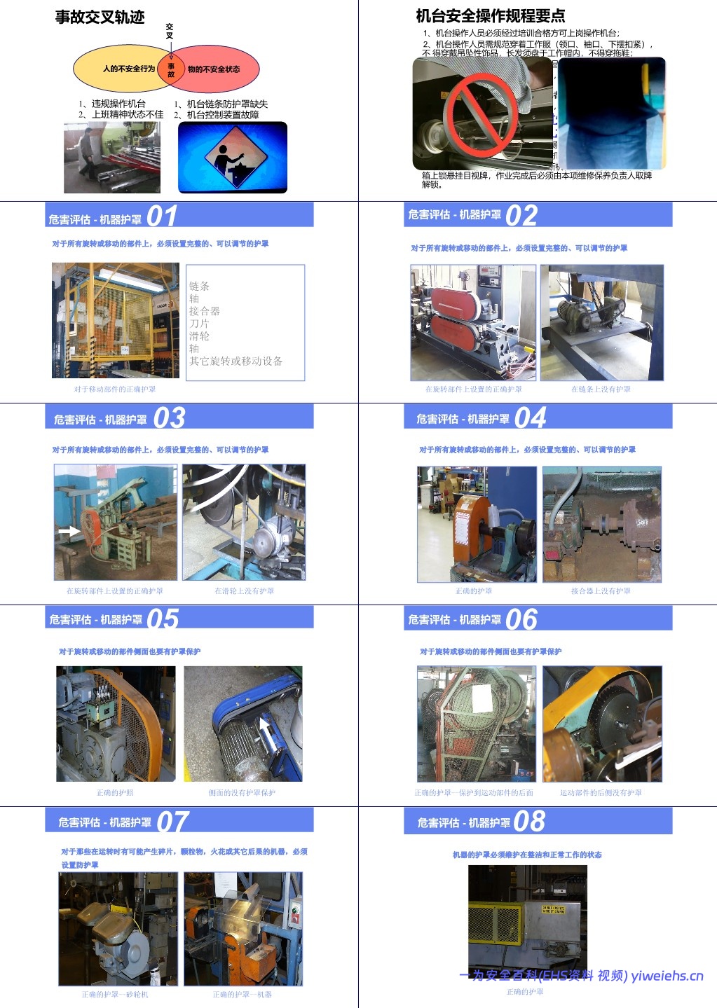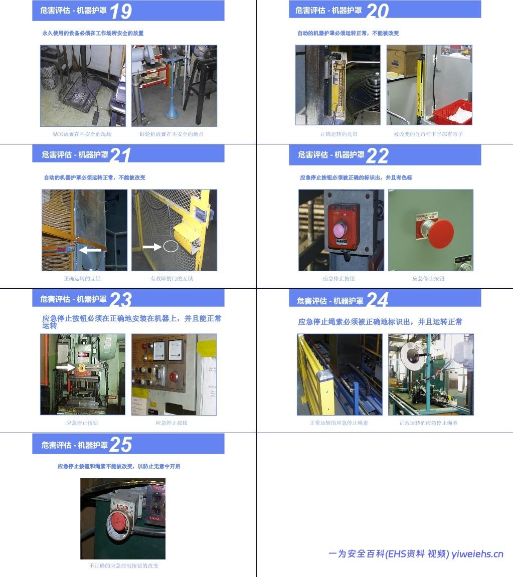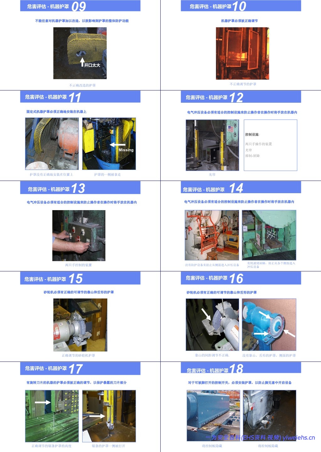 此外,文档还通过多组“危害评估”对比图(正确 vs 错误护罩安装),直观展示防护装置的设置标准,涵盖砂轮机、锯床、冲压设备等典型机械。