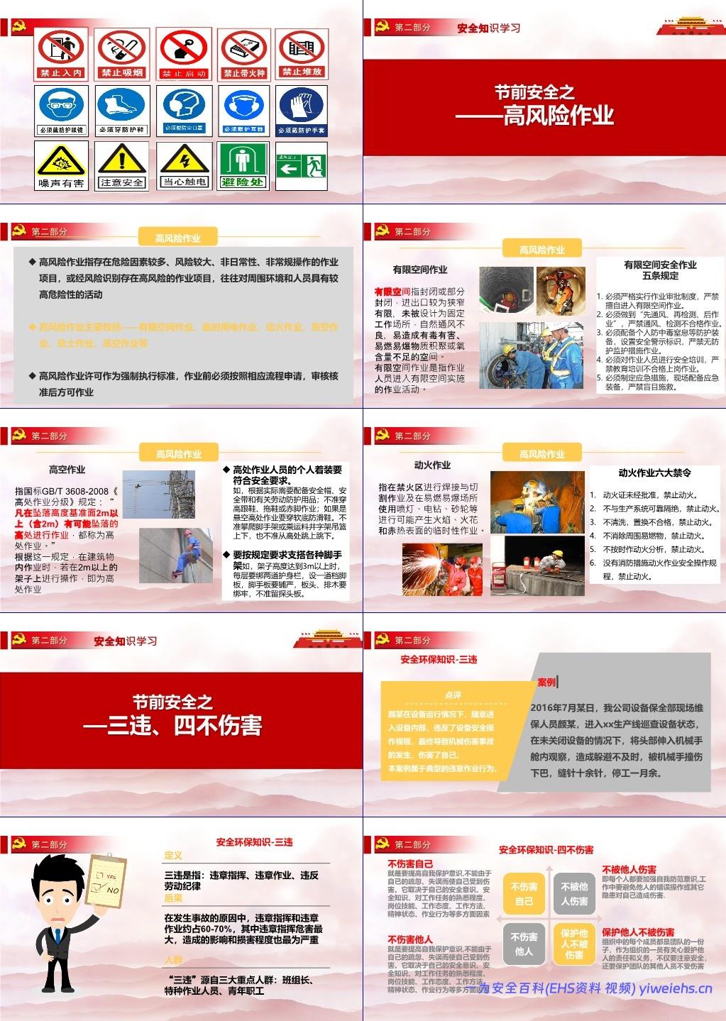 高风险作业:包括有限空间、动火、高空、临时用电等,强调作业许可与五项规定;