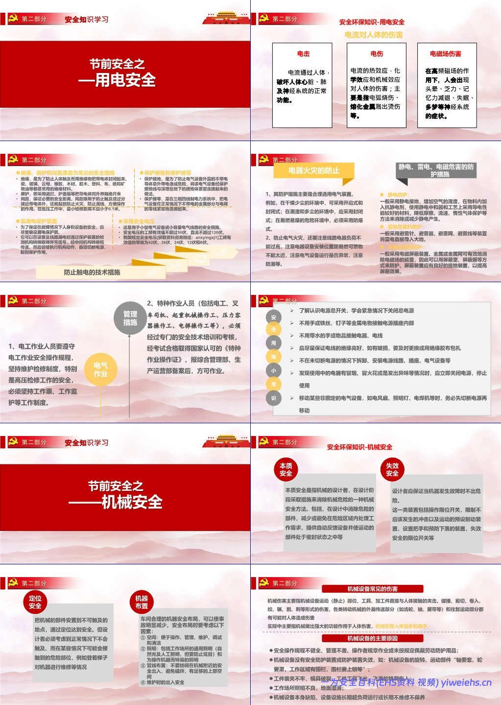 用电安全:讲解电击/电伤/电磁场伤害,提出绝缘、屏护、接地、漏保、安全电压等防护措施;