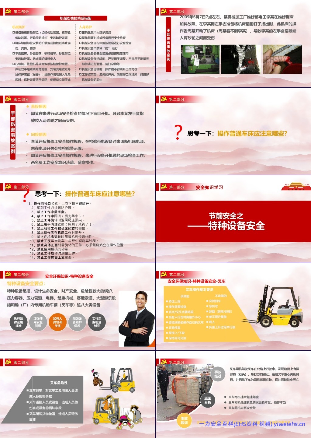 机械安全:强调本质安全、定位安全、防护装置(如光栅、双手按钮)、严禁带病运行;