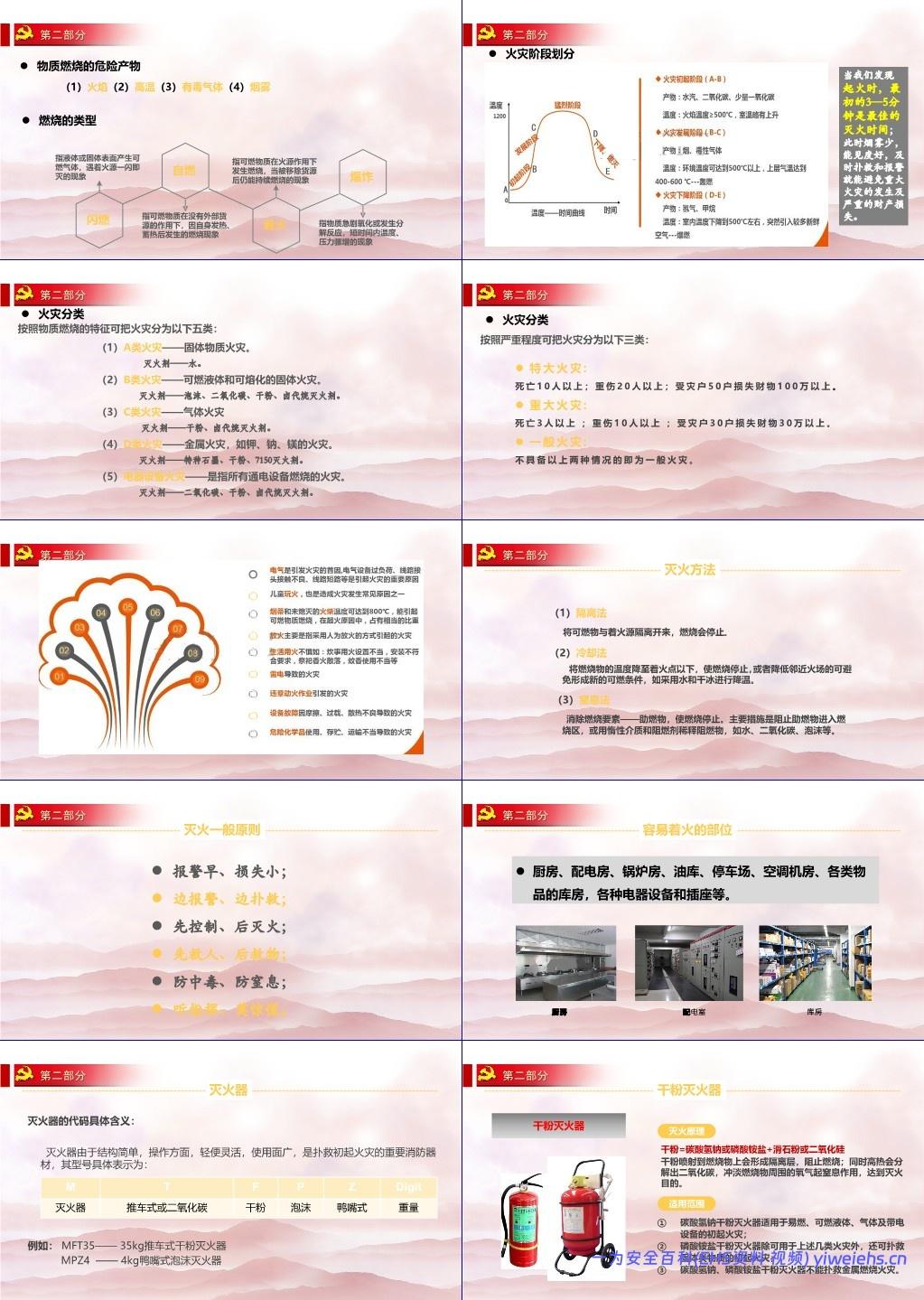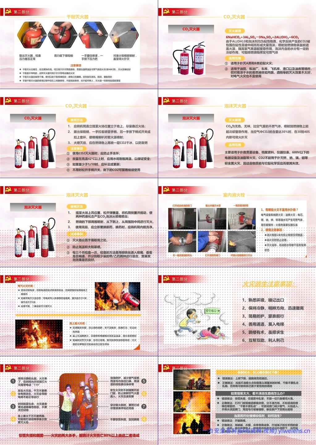 消防技能:讲解燃烧三要素、火灾分类(A-E类)、灭火方法(冷却、窒息、隔离)、灭火器使用(干粉、CO₂、泡沫)、逃生技巧(勿乘电梯、湿巾捂鼻、低姿撤离);