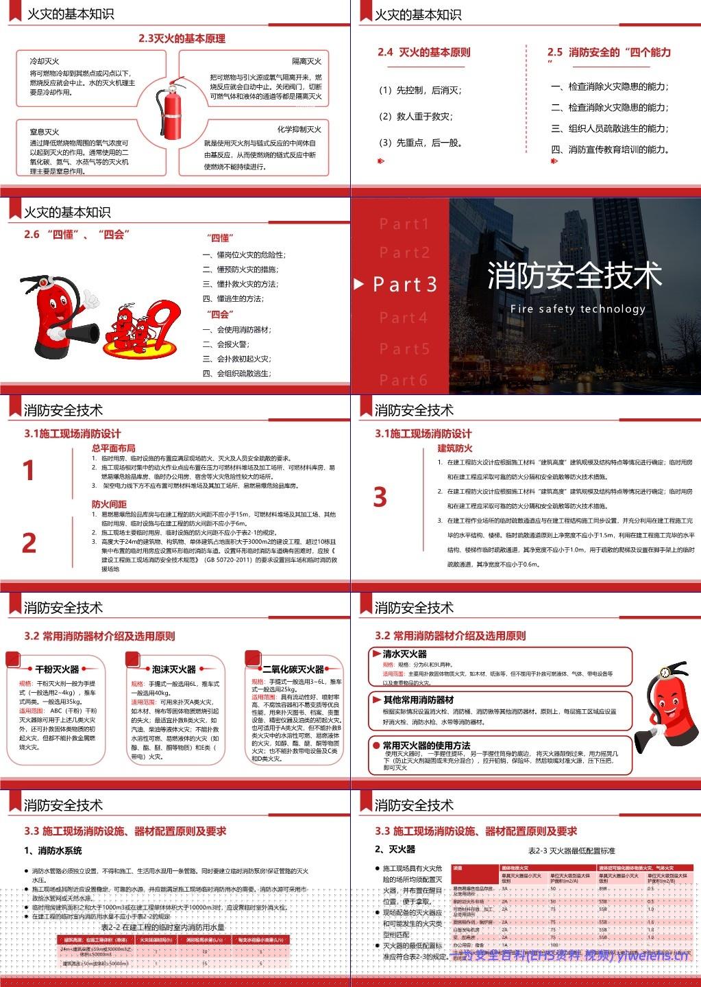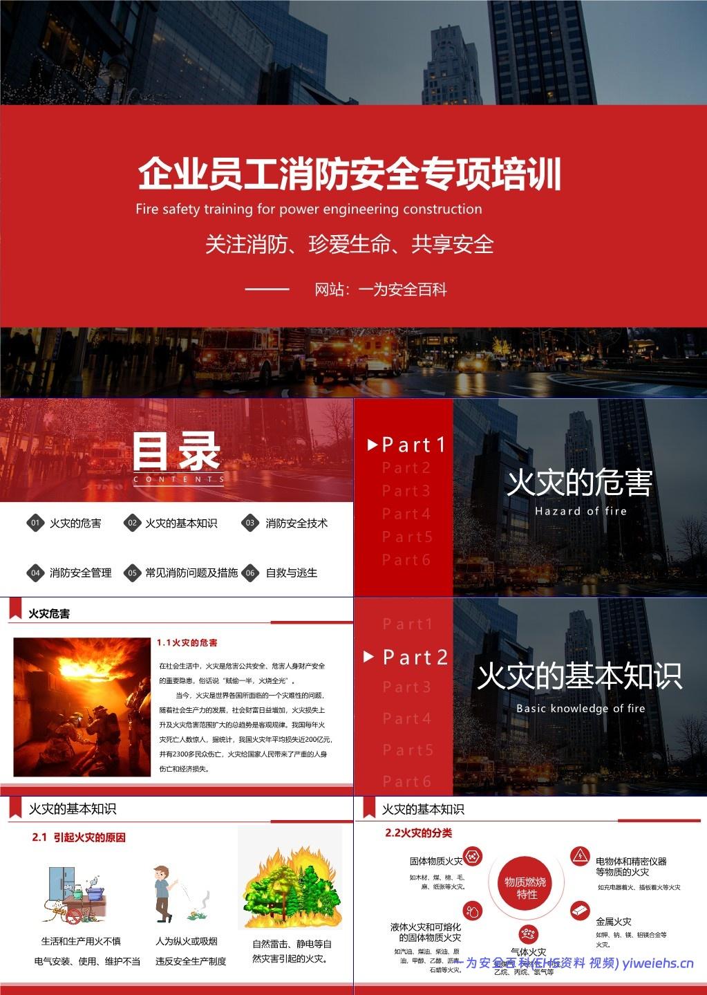 该文档旨在提升企业员工在工作场所(尤其是电力工程施工现场)的消防安全意识与应急处置能力。全文结构清晰,共分为六个部分: