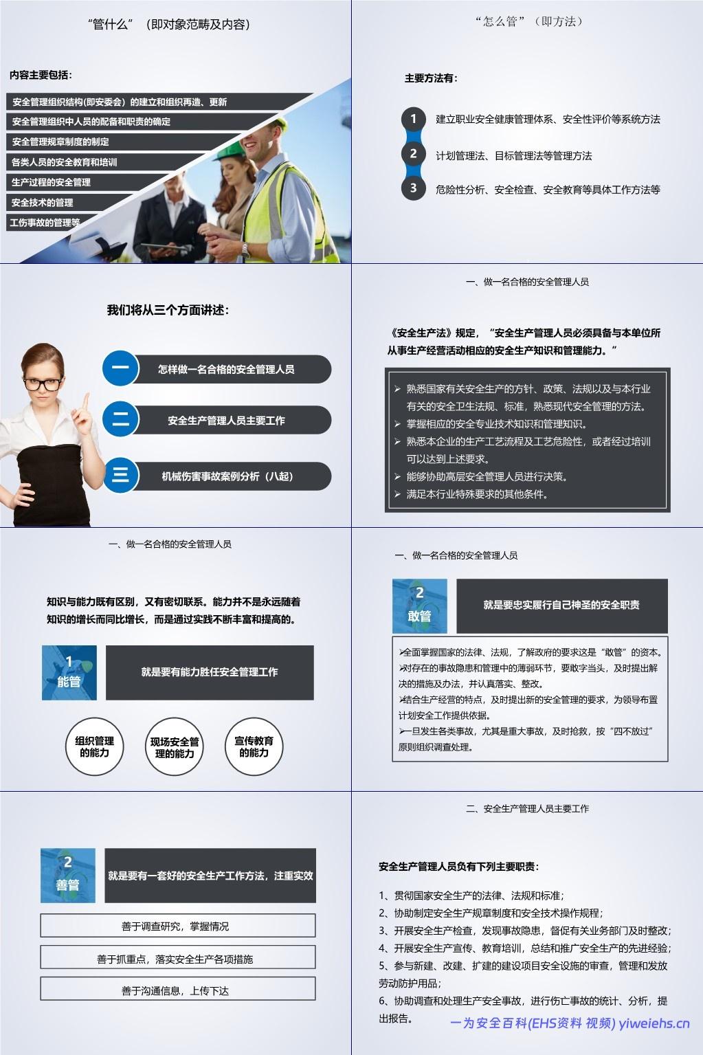 管什么:对象包括人(员工与管理者)、财(安全经费)、物(设备、材料、能源)、环境;内容涵盖组织建设、制度制定、教育培训、过程管控、技术管理、事故处理等。