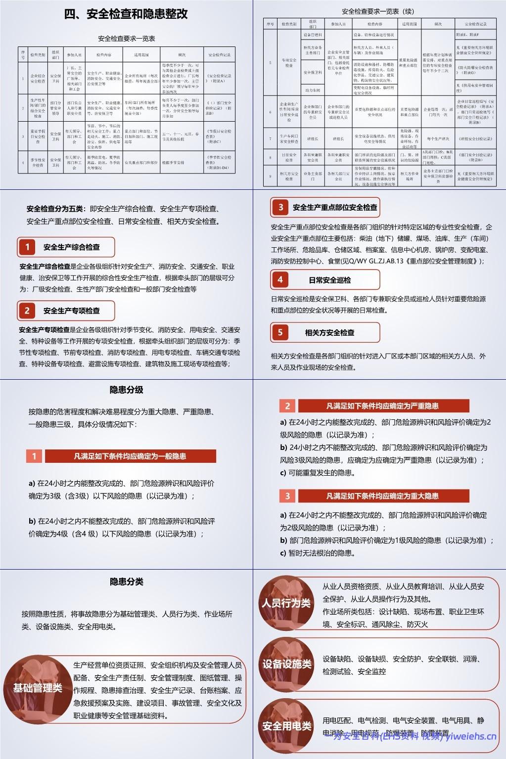 安全检查:分为综合、专项、季节性、日常、相关方等类型,内容涵盖查现场、查思想、查制度、查事故处理,实施程序包括制定检查表、现场检查、整改闭环。