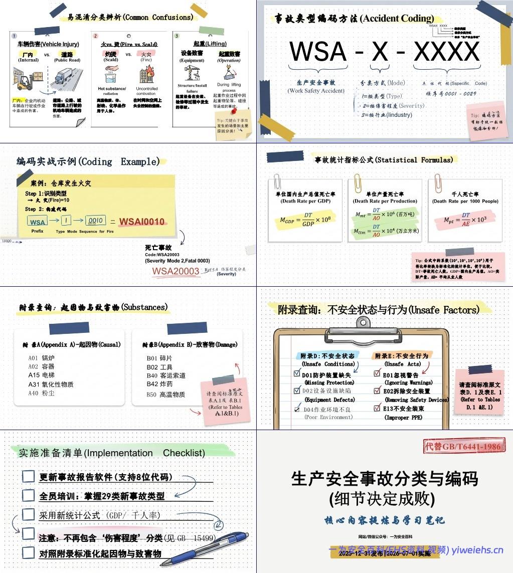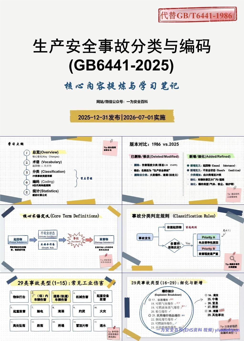 国家标准 《生产安全事故分类与编码》(GB 6441-2025) 的解读性学习资料,旨在帮助安全管理人员、企业及相关从业人员理解和应用新版标准。该标准于 2025年12月31日发布,2026年7月1日正式实施,全面替代1986年版的 GB/T 6441-1986。