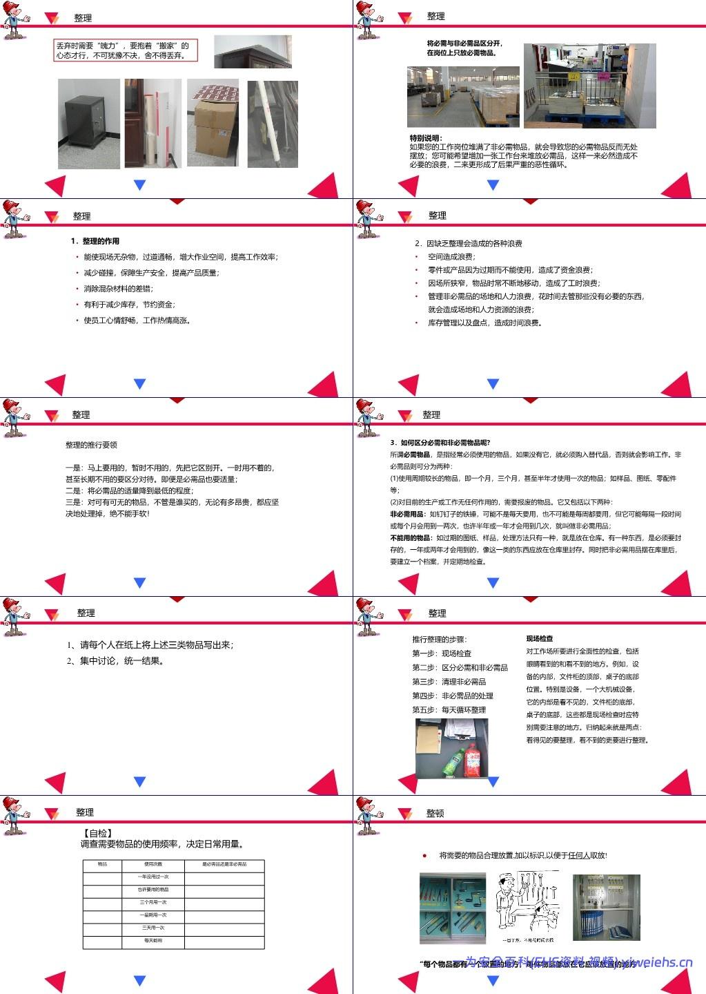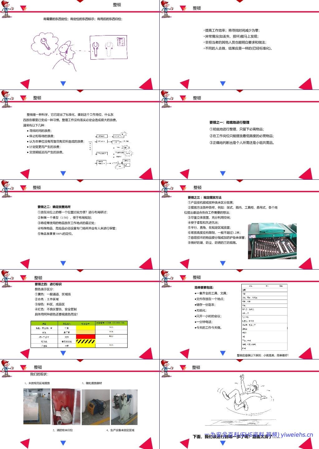 要领:彻底整理 → 确定放置场所 → 规定摆放方法 → 进行颜色/区域标识;