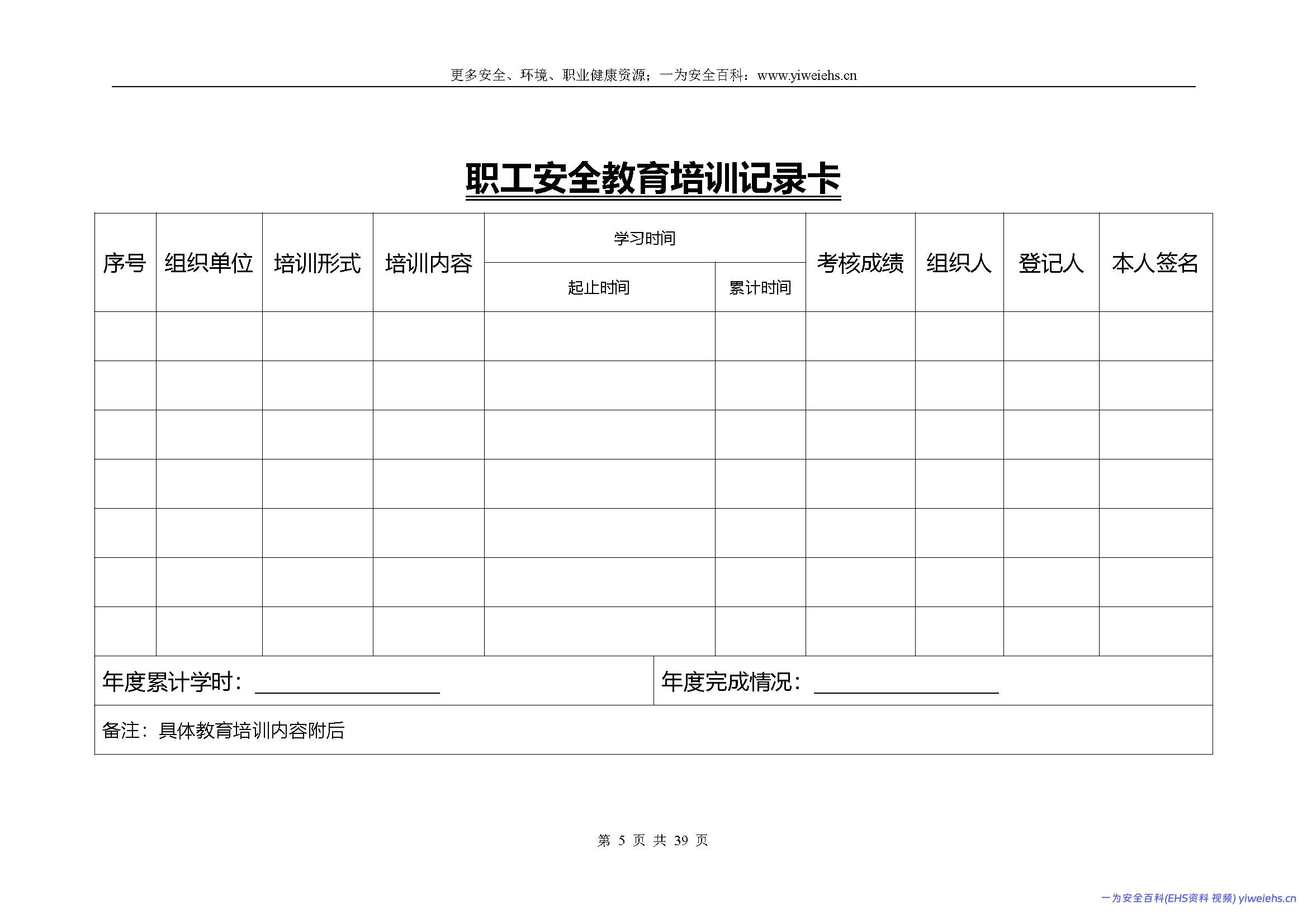 年度安全教育培训记录卡:用于登记历次培训的时间、形式、内容、考核成绩、组织人及本人签名,便于追踪年度学时完成情况。