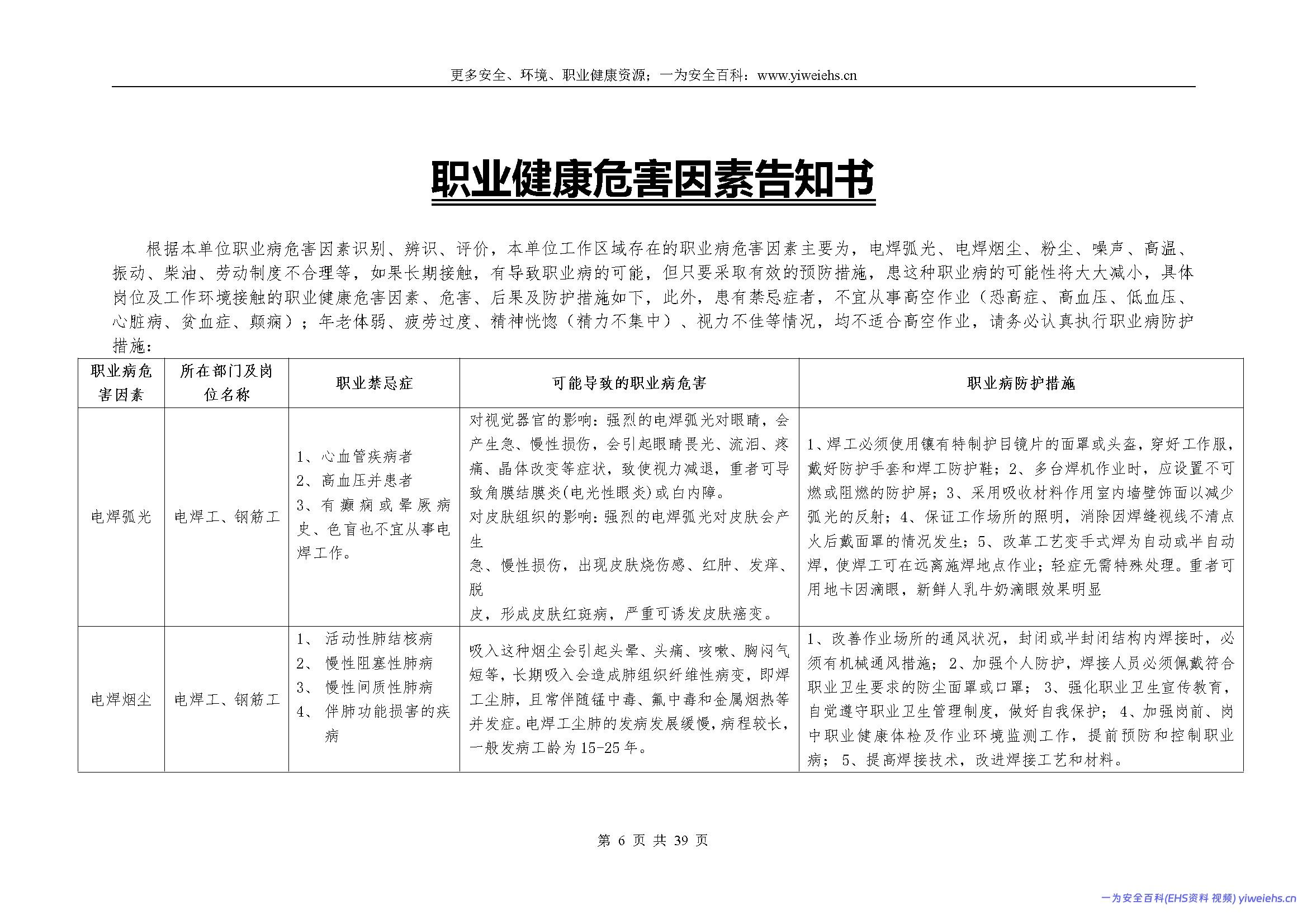 职业健康危害因素告知书:详细列出企业存在的主要职业病危害因素(如电焊弧光、电焊烟尘、粉尘、噪声、高温、振动、柴油、心理紧张等),并对应说明所在岗位、禁忌症、可能导致的职业病及具体防护措施。