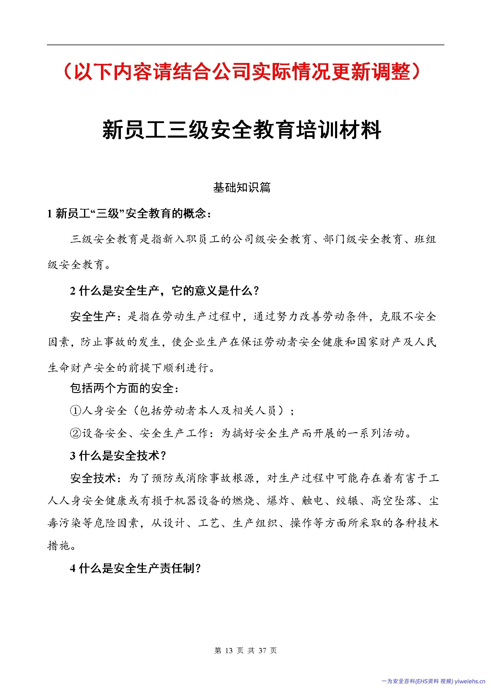 基础知识篇:解释“三级安全教育”概念、安全生产定义、安全技术、责任制、“安全第一、预防为主、综合治理”方针等。