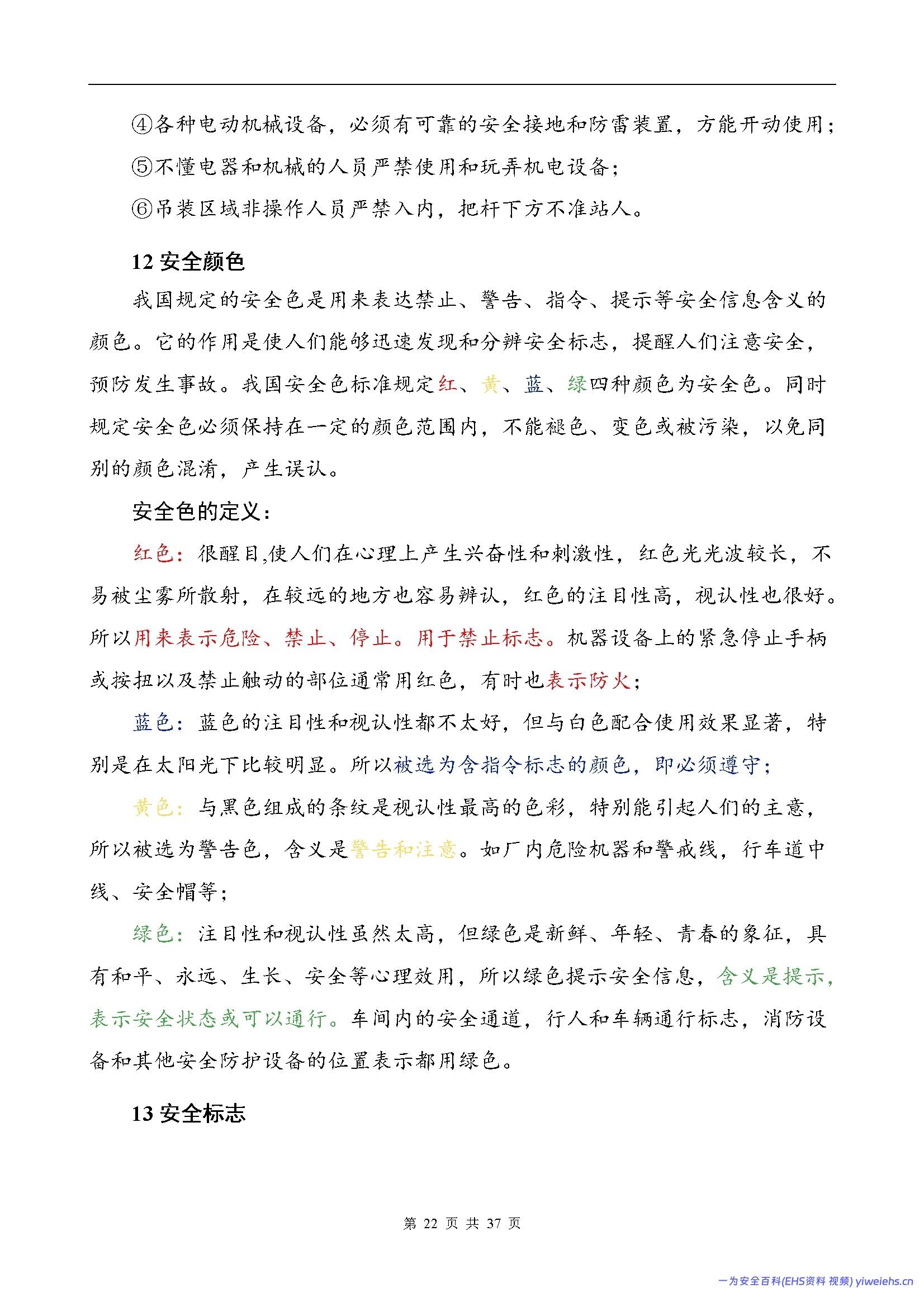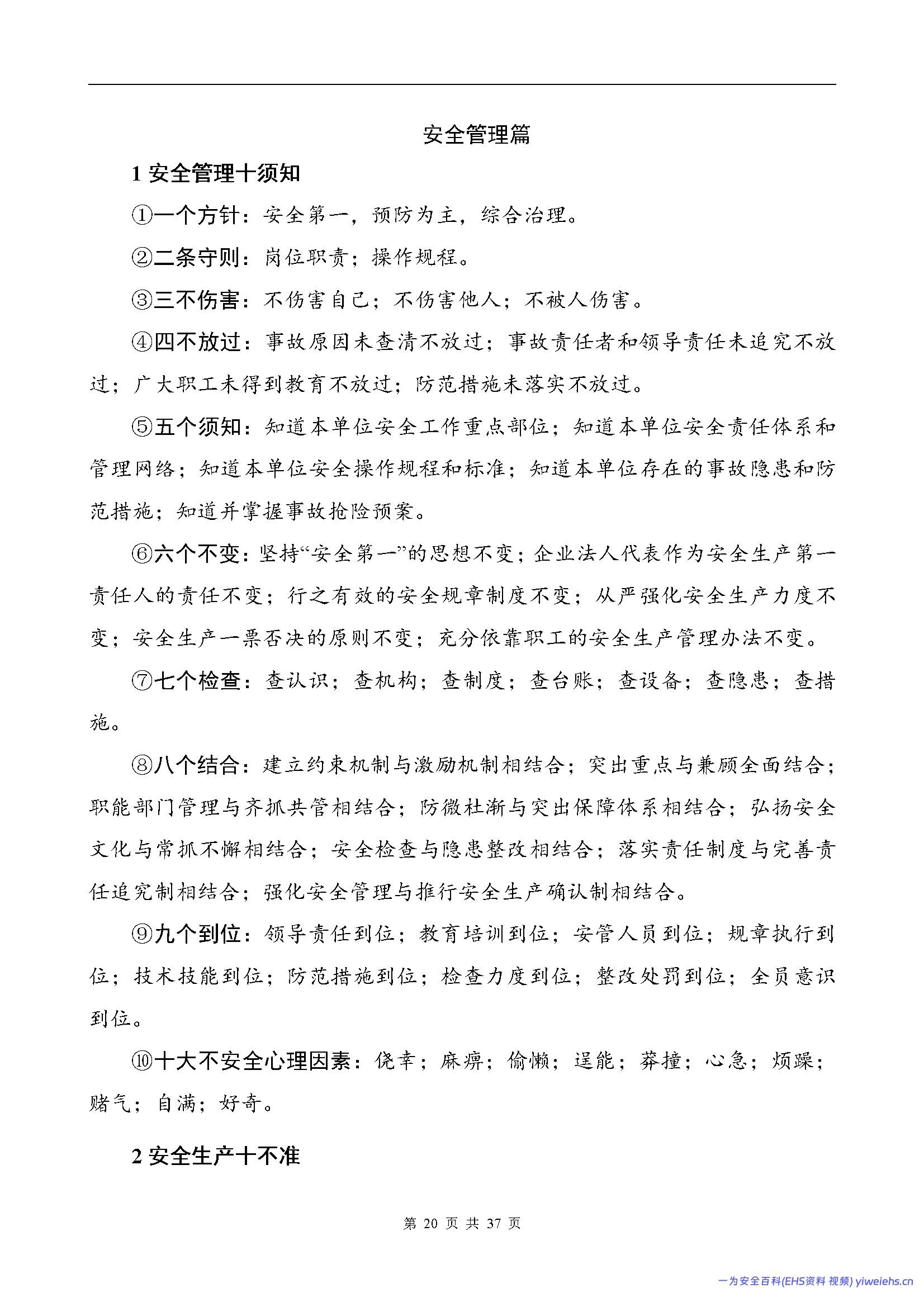 安全管理篇:提出“安全管理十须知”“安全生产十不准”“三违”“四不伤害”“三同时”“五同时”等管理原则,并介绍安全色、安全标志、灭火器材使用等。