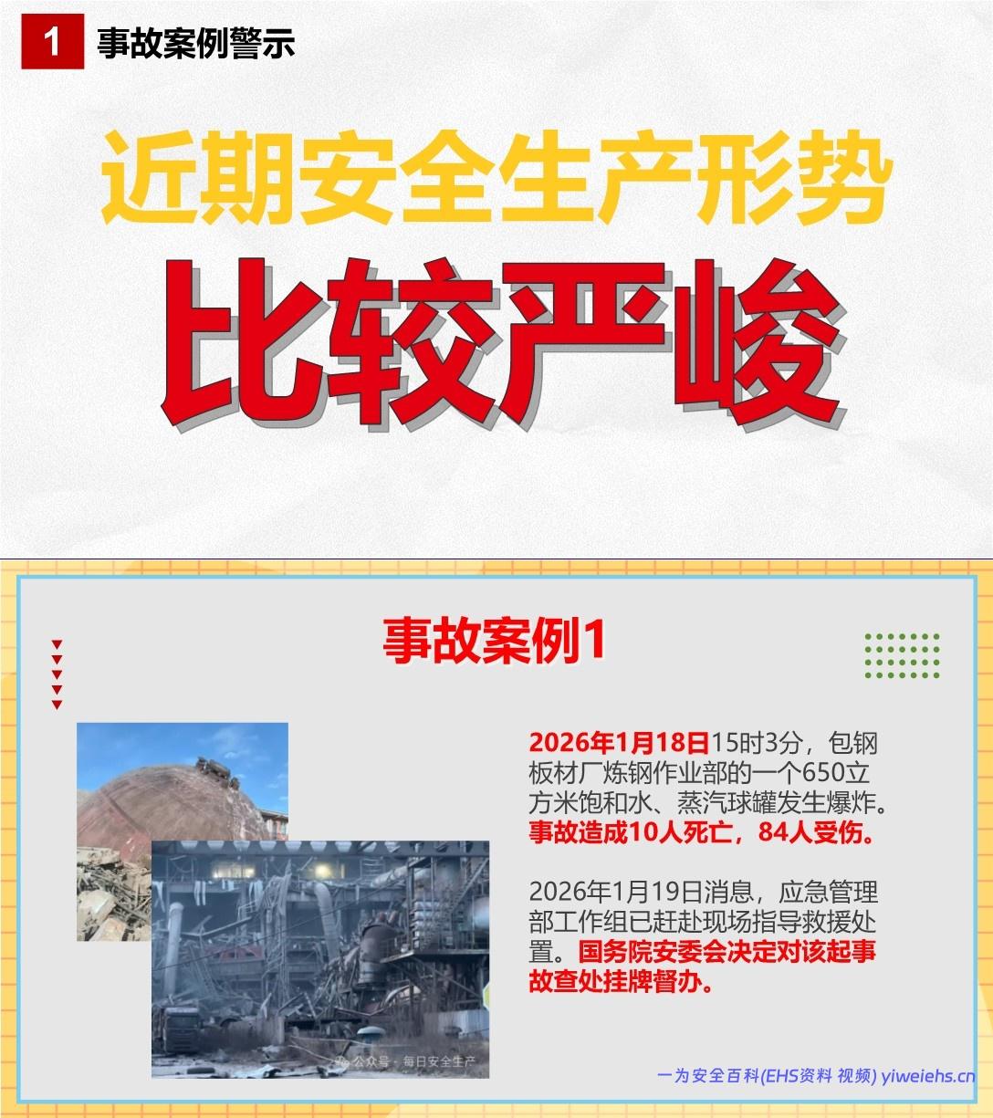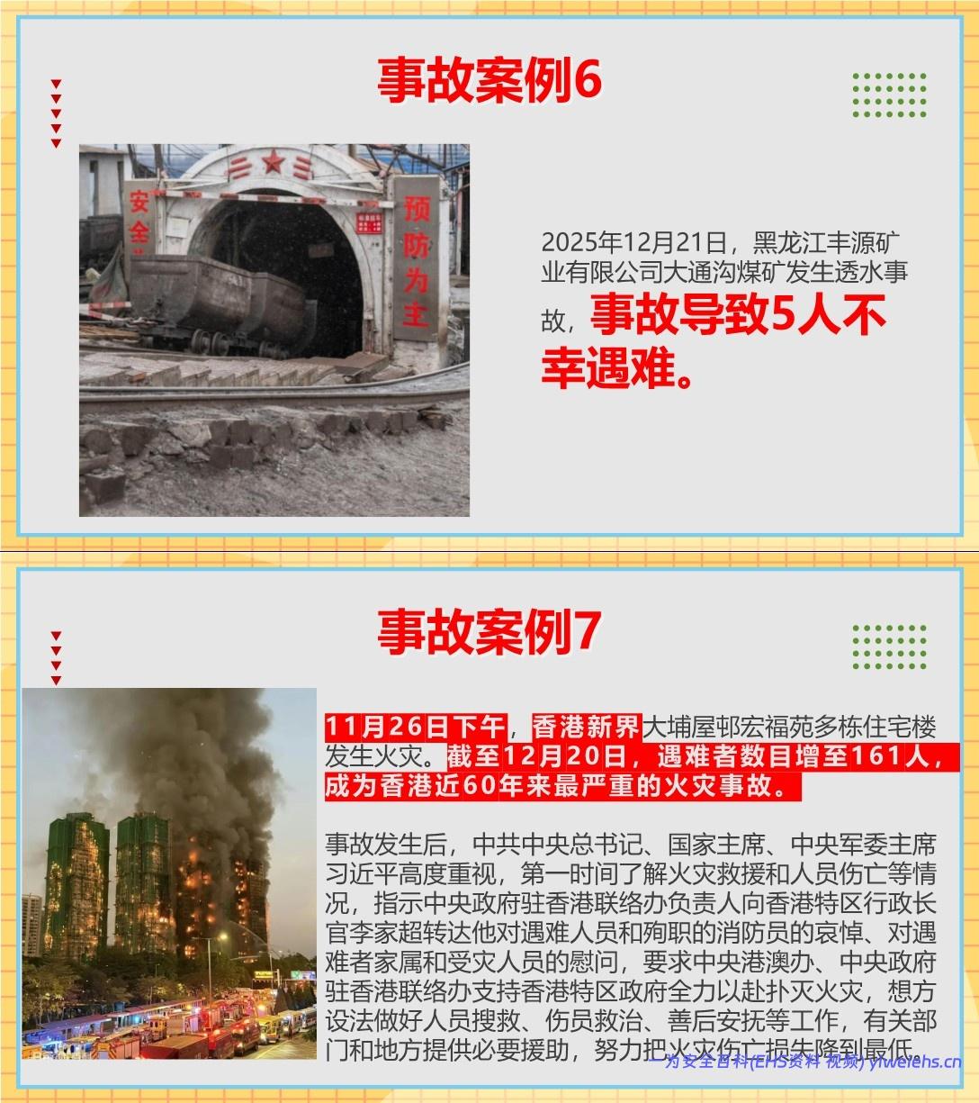 列举了2025年12月至2026年1月期间发生的7起重大安全事故案例,涵盖工业爆炸(包钢板材厂球罐爆炸)、交通事故(介休两车相撞)、中毒窒息(内蒙古焦化厂硫化氢泄漏)、煤矿事故(云南煤与瓦斯突出、黑龙江透水)、以及香港大埔火灾等,强调岁末年初是事故高发期。