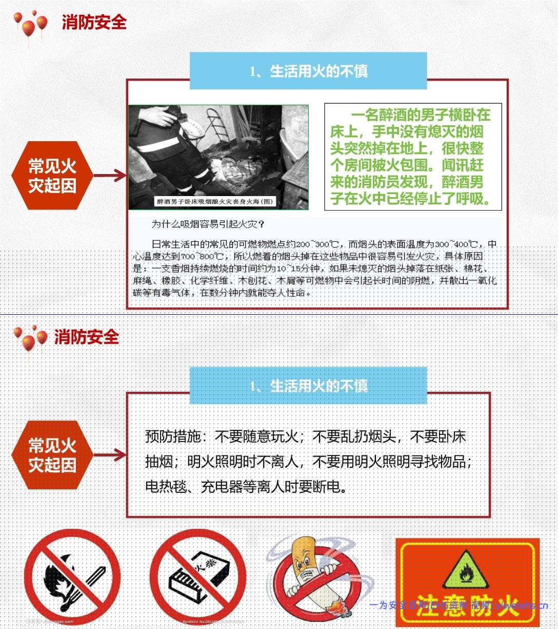 分析常见火灾原因:生活用火不慎(烟头、电热毯)、电气故障、燃气泄漏、节日期间管理松懈。