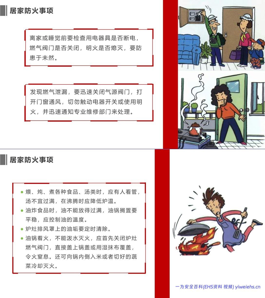 居家防火:炖煮有人看管、油锅着火盖锅盖、定期清油烟机。