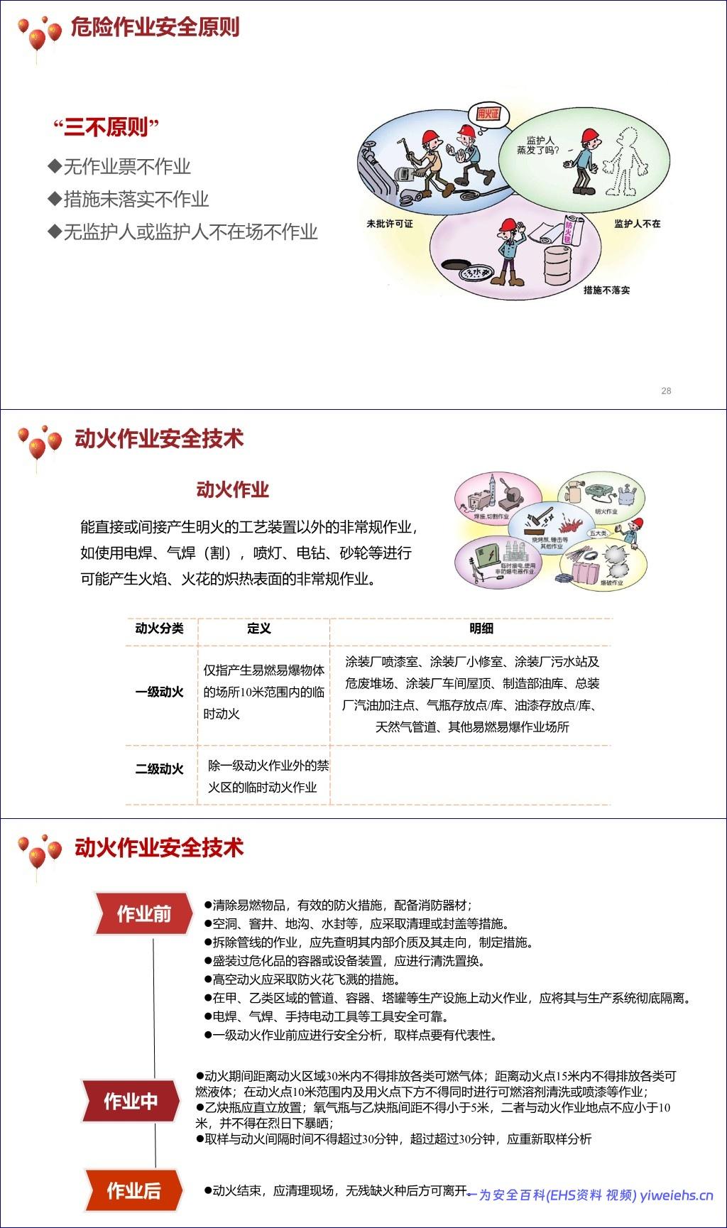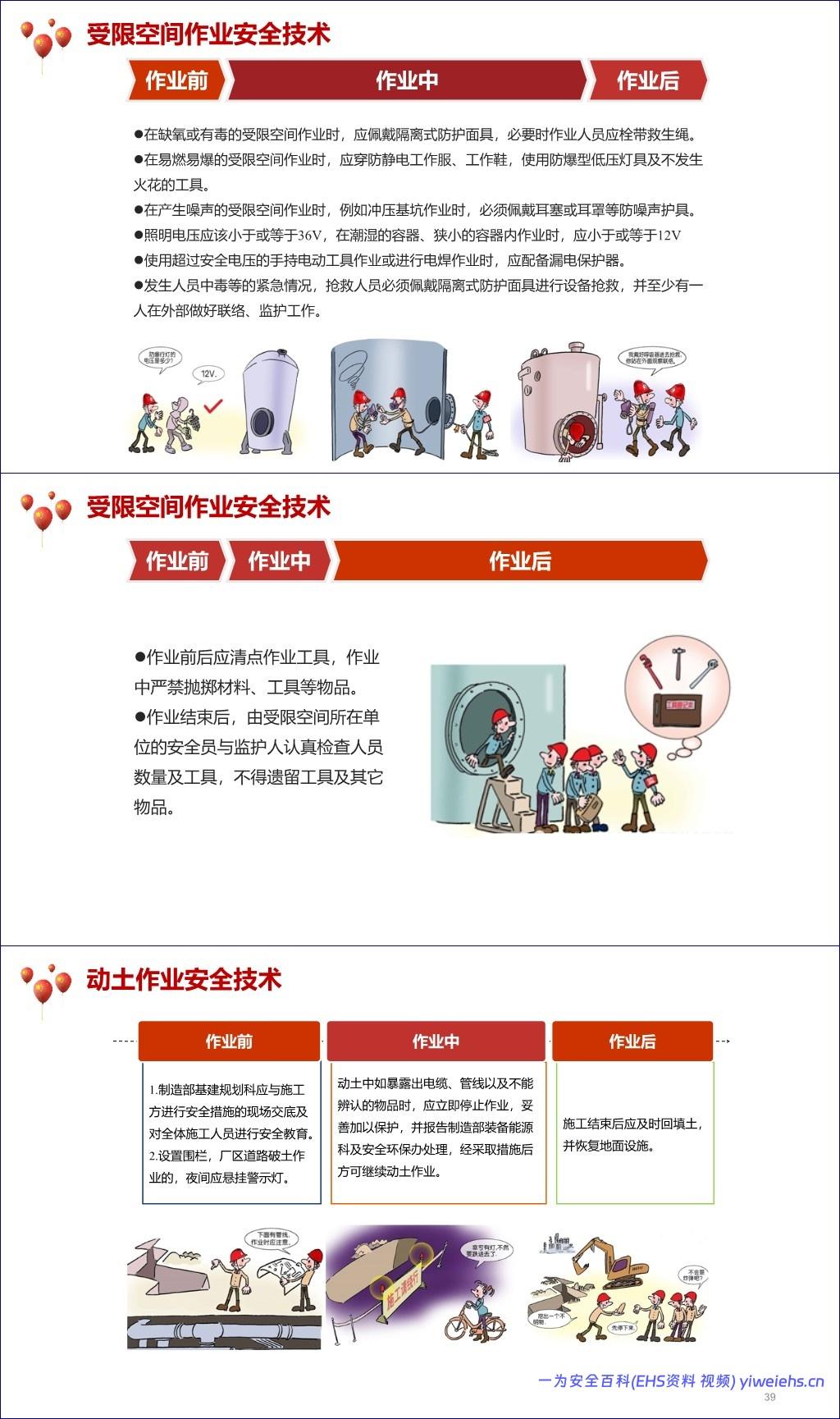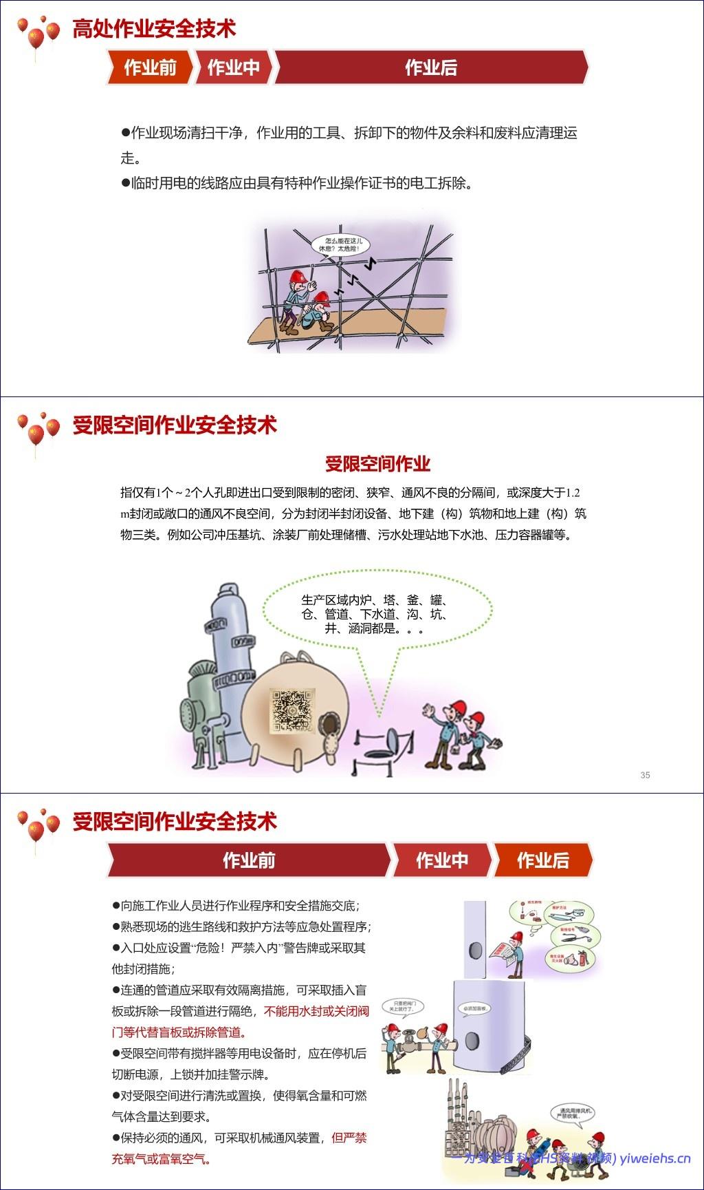 受限空间:强制通风、气体检测、隔离能源、使用防爆工具、外部监护、应急救援准备。