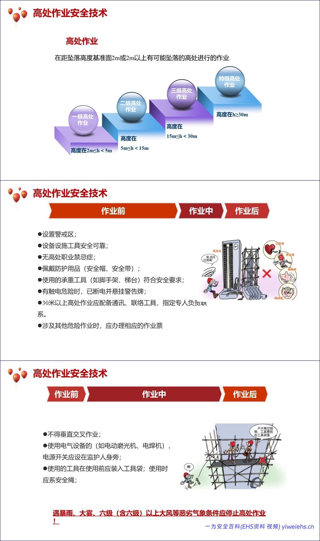 高处作业:按高度分级,禁酒后/带病作业,佩戴安全带(高挂低用),设警戒区,恶劣天气停工。