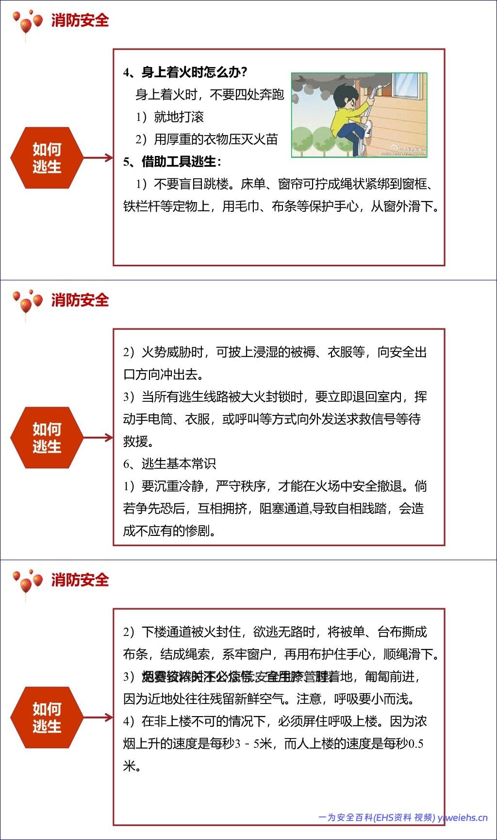 逃生要点:保持冷静、防烟(湿毛巾/匍匐)、不贪财物、不盲目跳楼、利用床单结绳、被封锁时发求救信号。