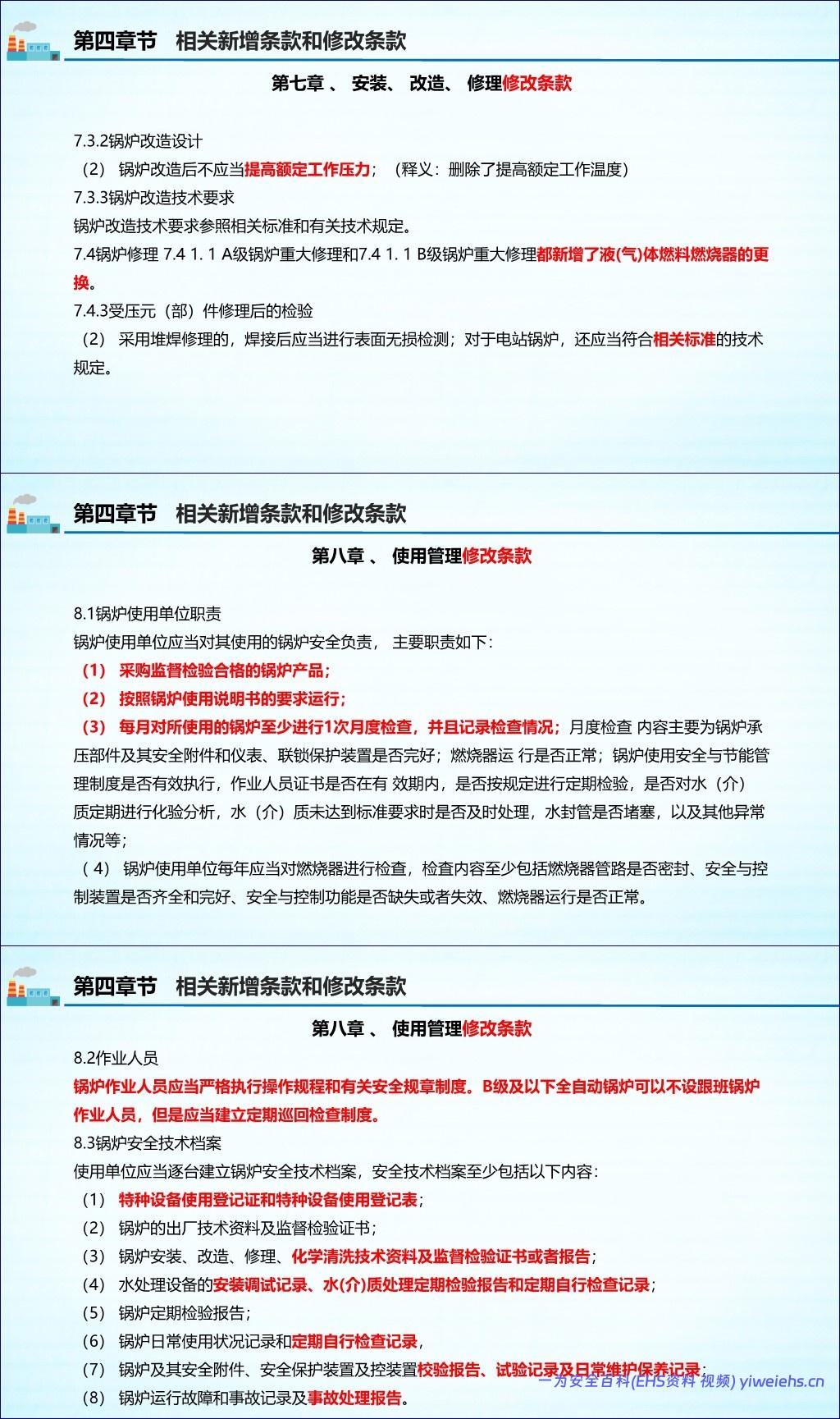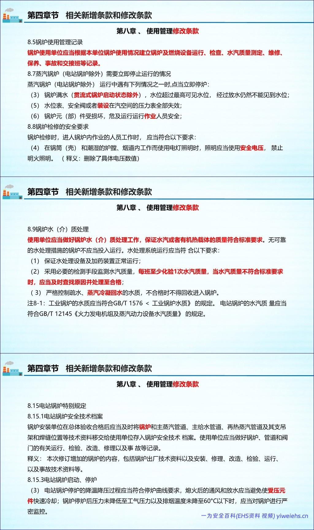 使用管理:强化了使用单位的主体责任,要求建立安全技术档案、进行月度检查、做好水(介)质处理,并明确了紧急停炉的情形。