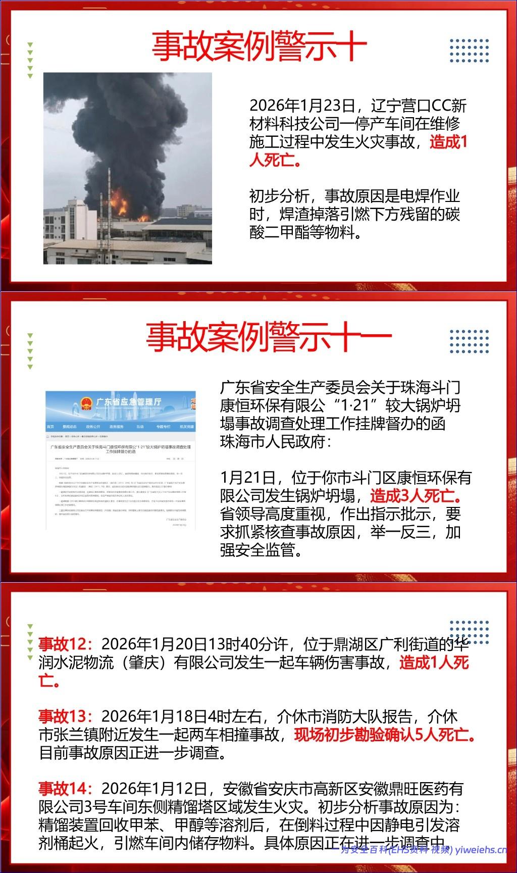 该文档是《2026年春节前安全教育培训》PPT,由“一为安全百科”提供,旨在加强节前安全生产意识、防范各类安全事故。全文分为四个主要章节,并附有大量近期典型事故案例作为警示。