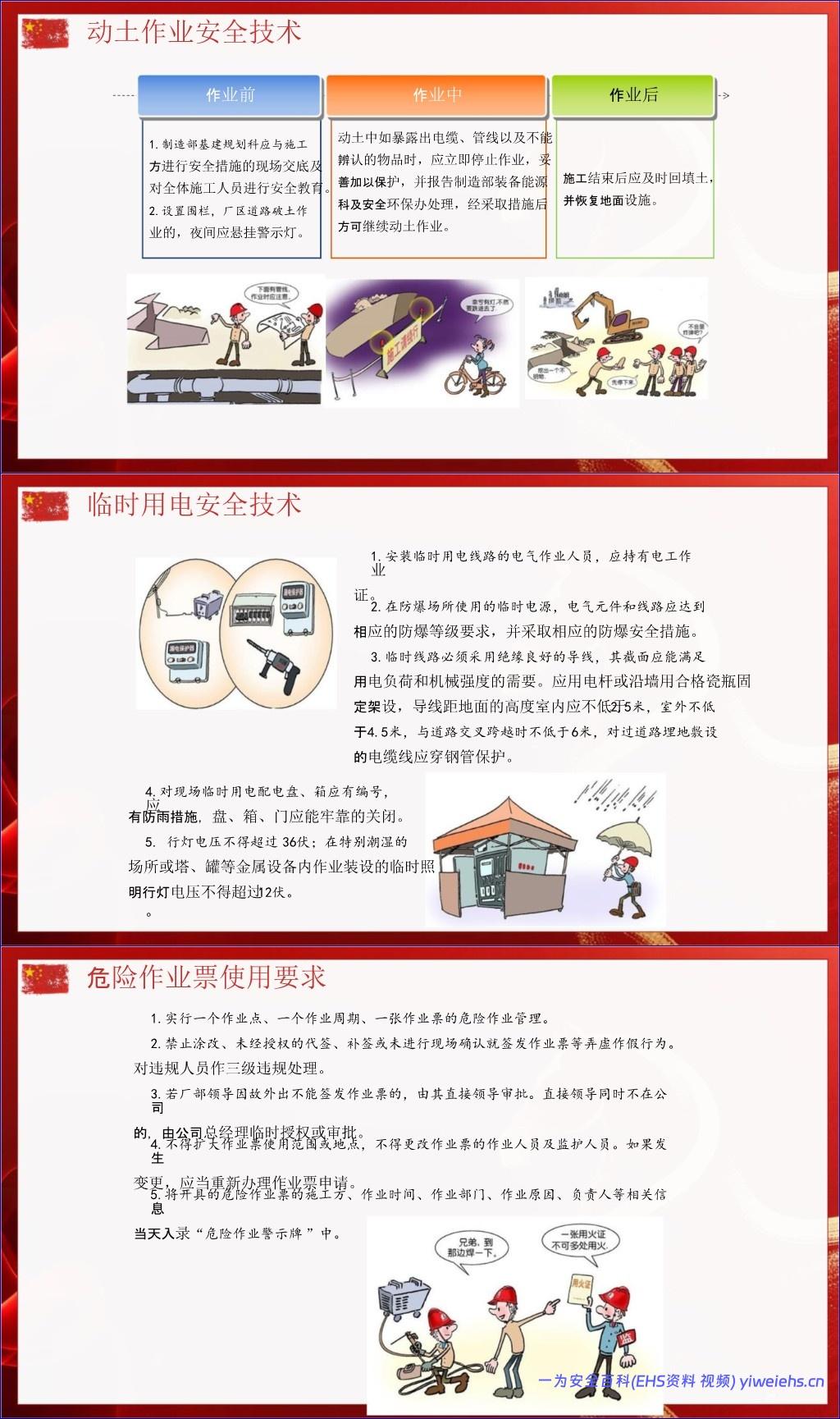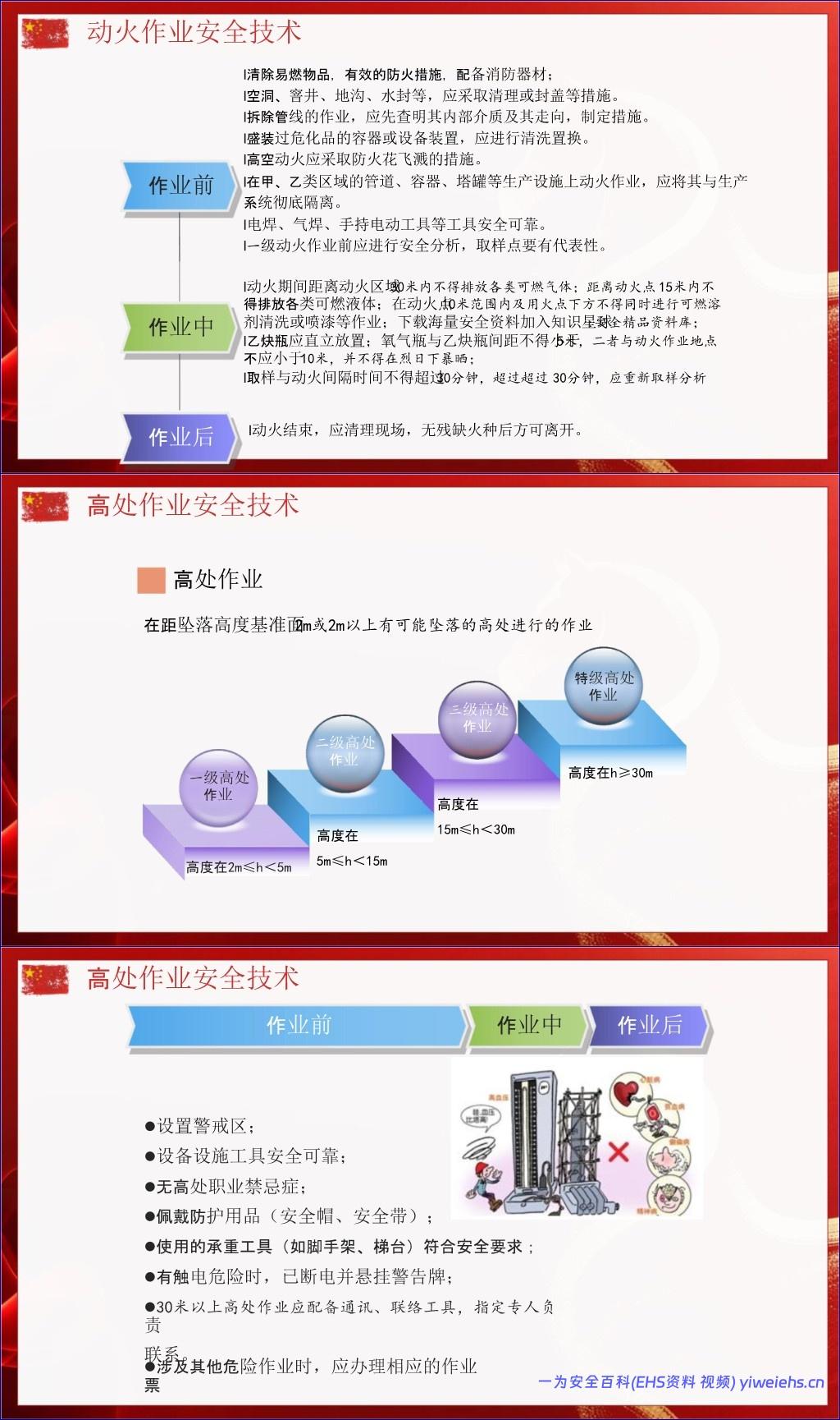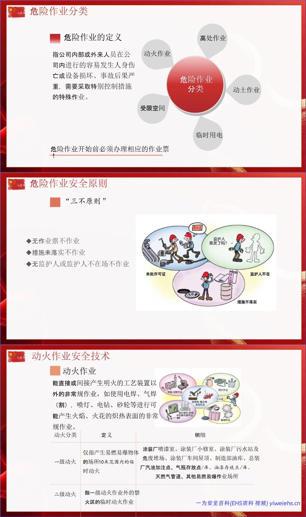 动火作业:分级管理(一级/二级),强调清理易燃物、气体检测、气瓶间距、防火花飞溅。