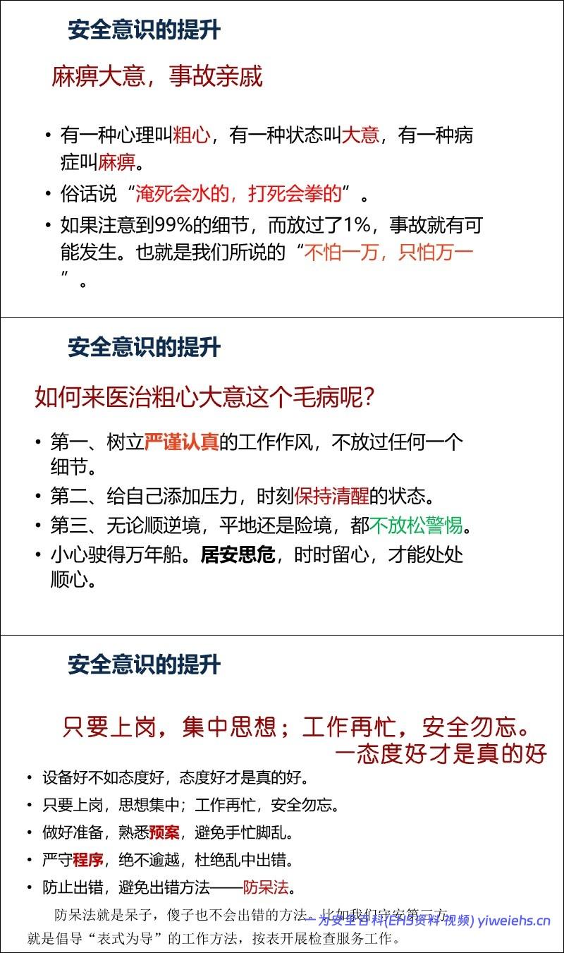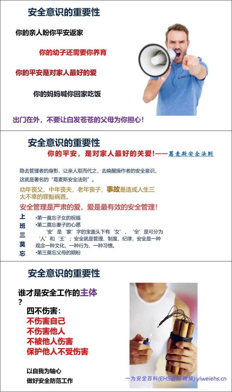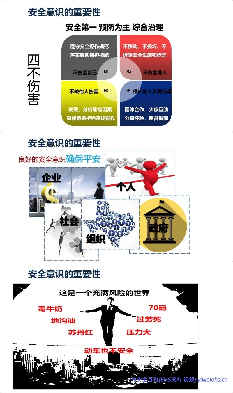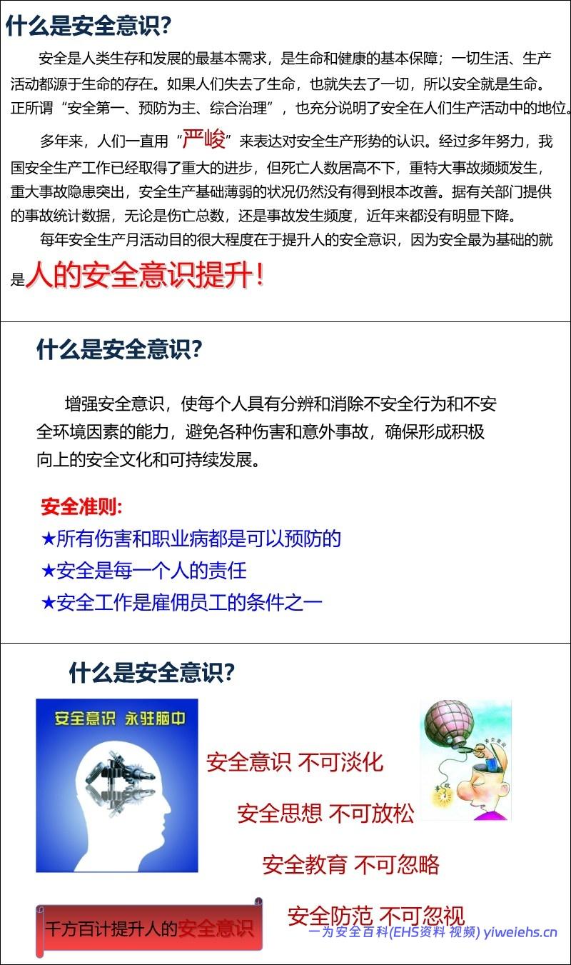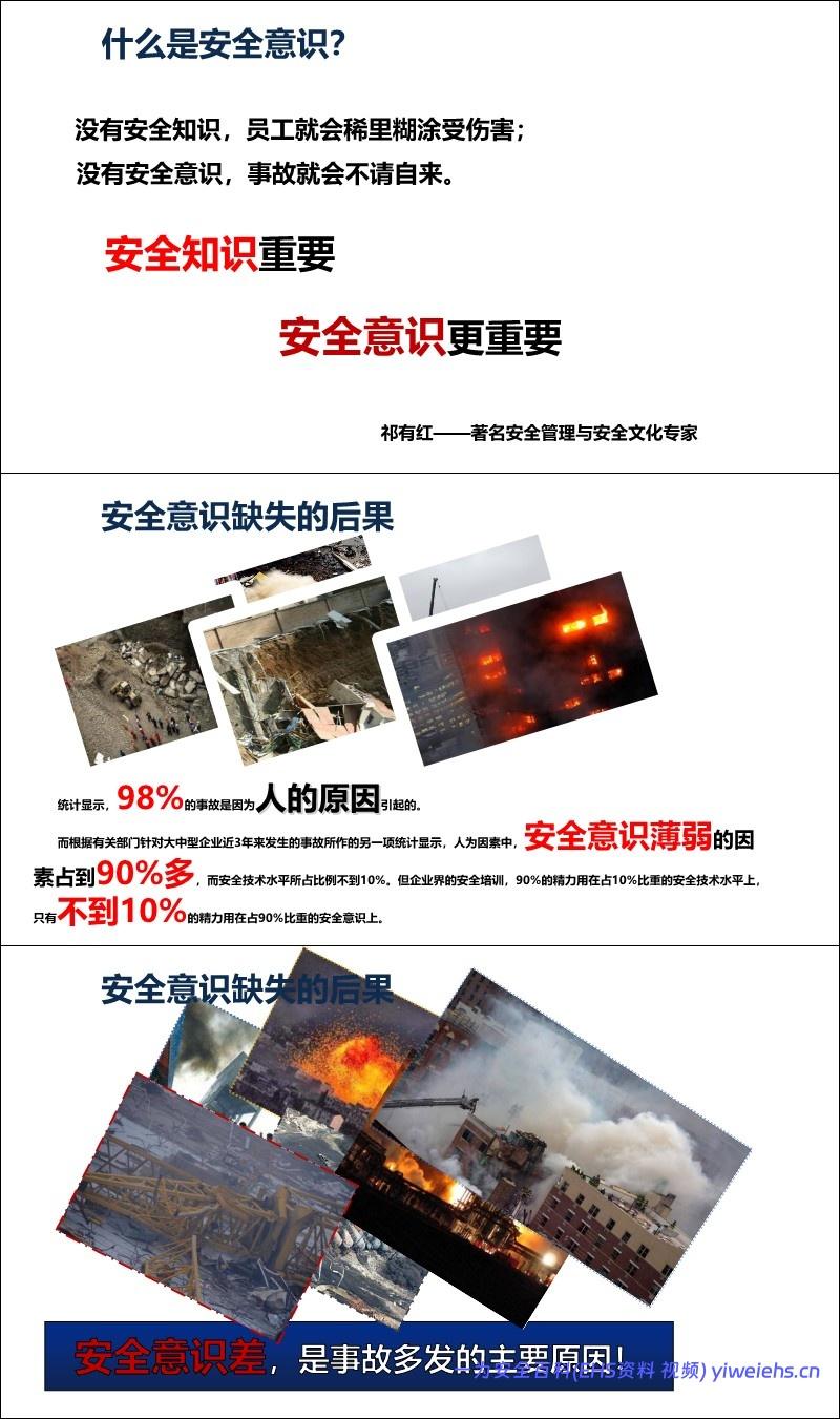 意识重于技能: 引用数据表明98%的事故由人为因素引起,其中90%以上是安全意识薄弱。强调“安全第一、预防为主、综合治理”。