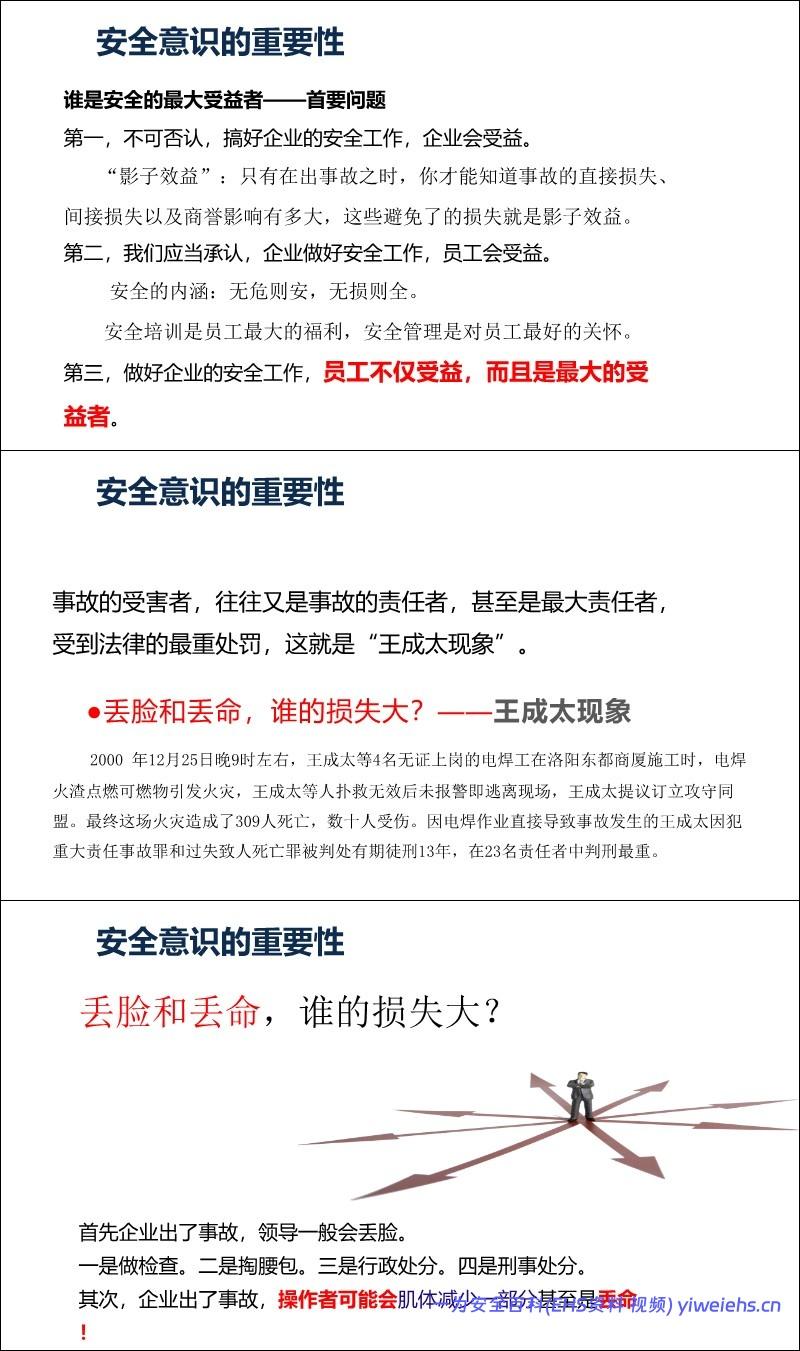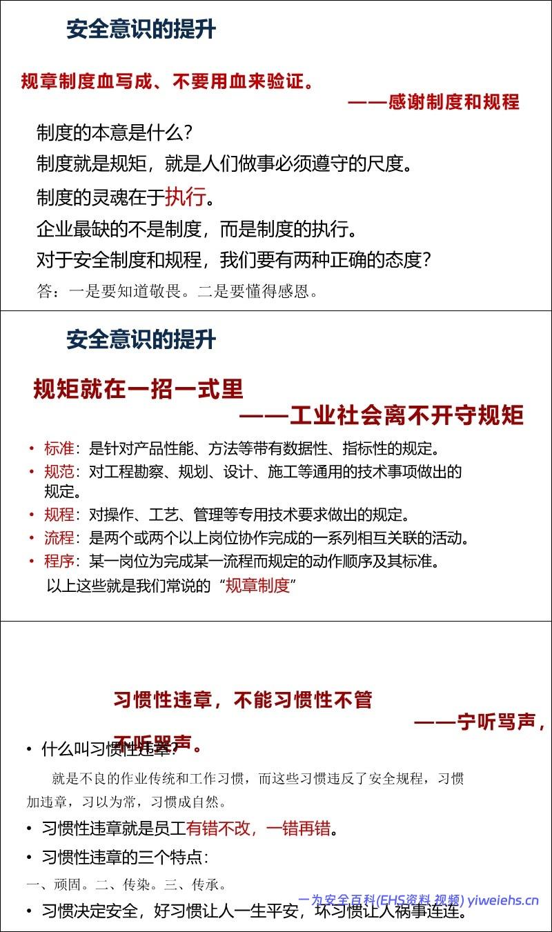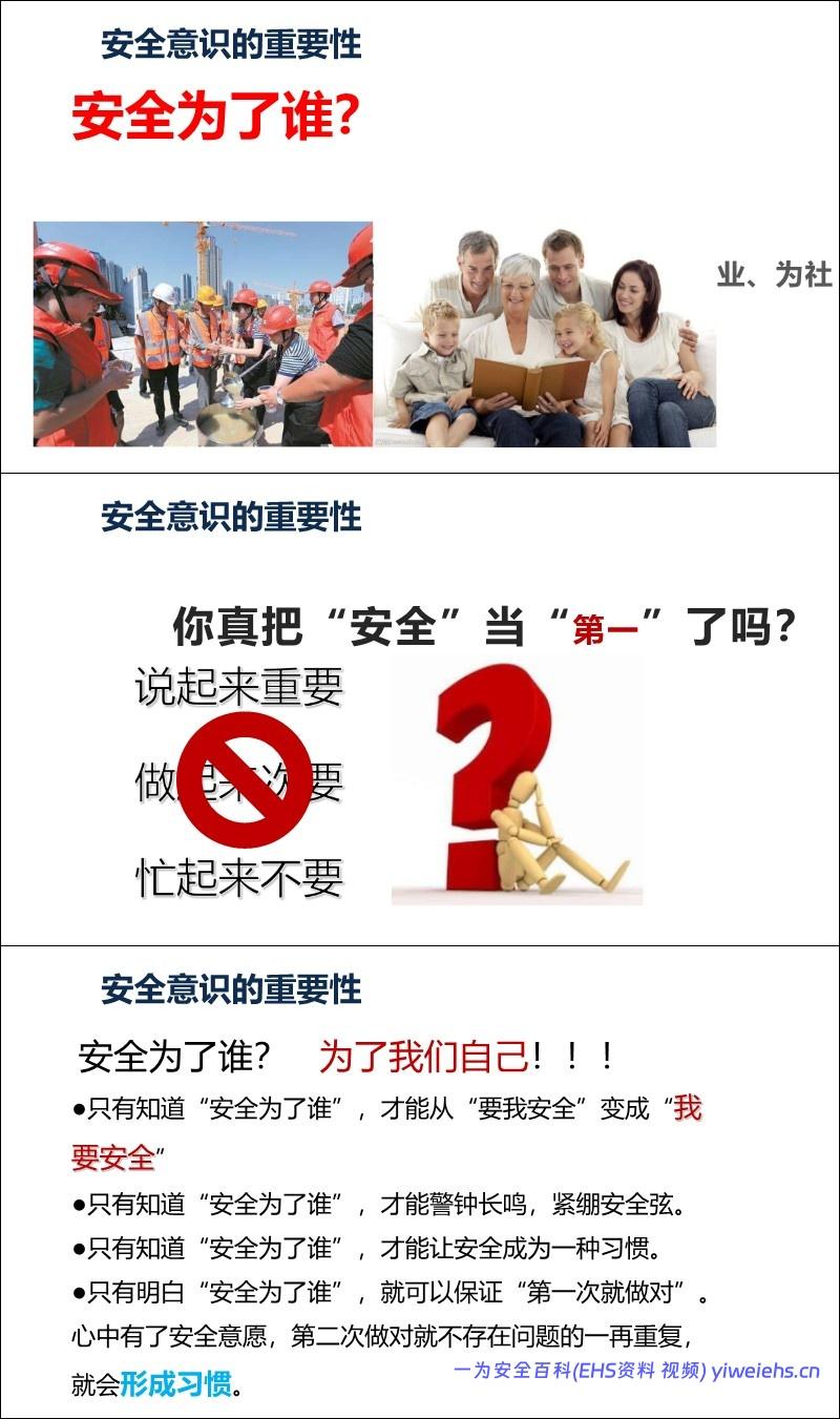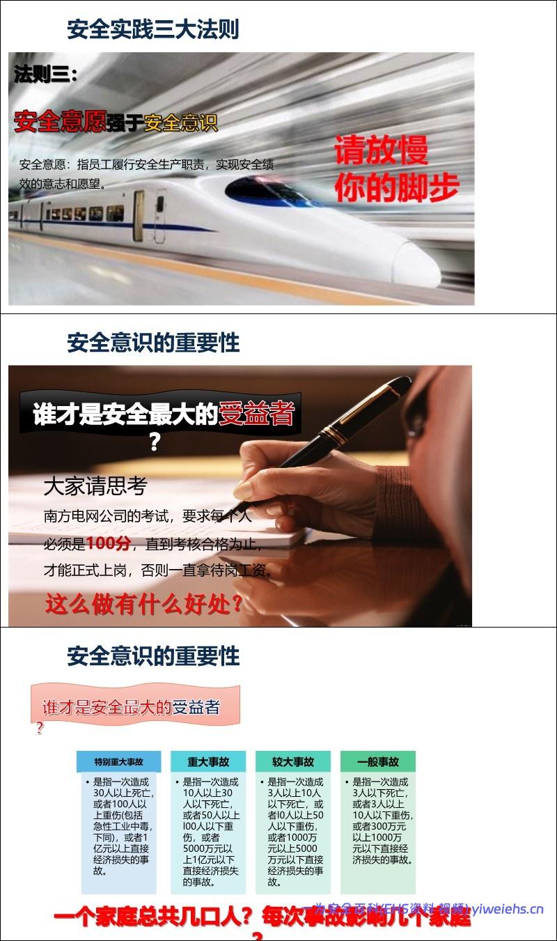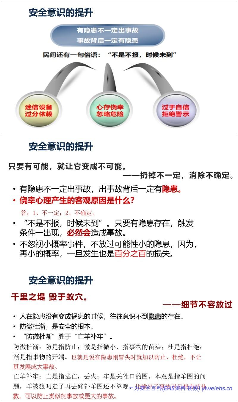 意识重于技能: 引用数据表明98%的事故由人为因素引起,其中90%以上是安全意识薄弱。强调“安全第一、预防为主、综合治理”。