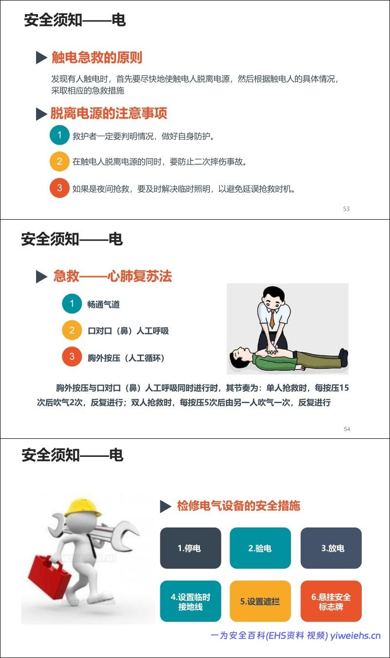 用电安全: 讲解触电类型、规律、急救方法(心肺复苏)及检修措施(停电、验电、放电等)。