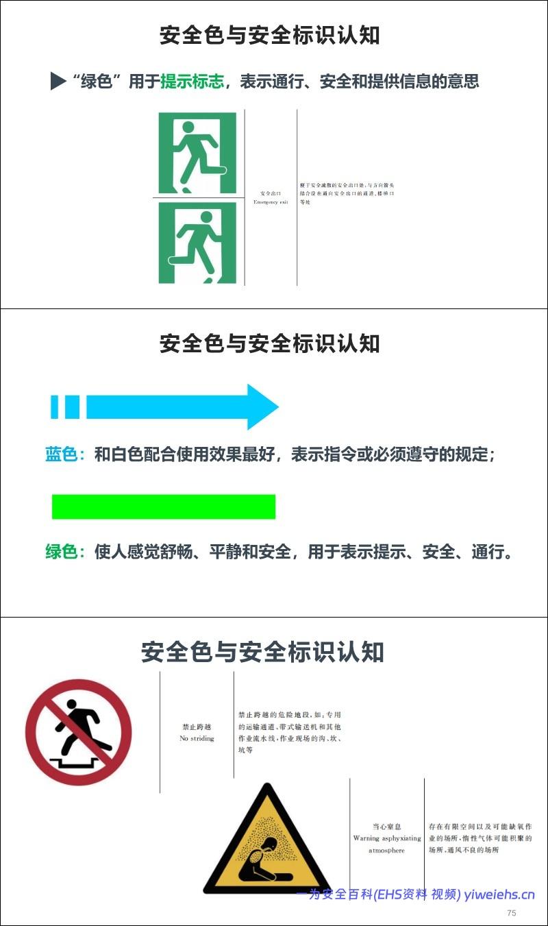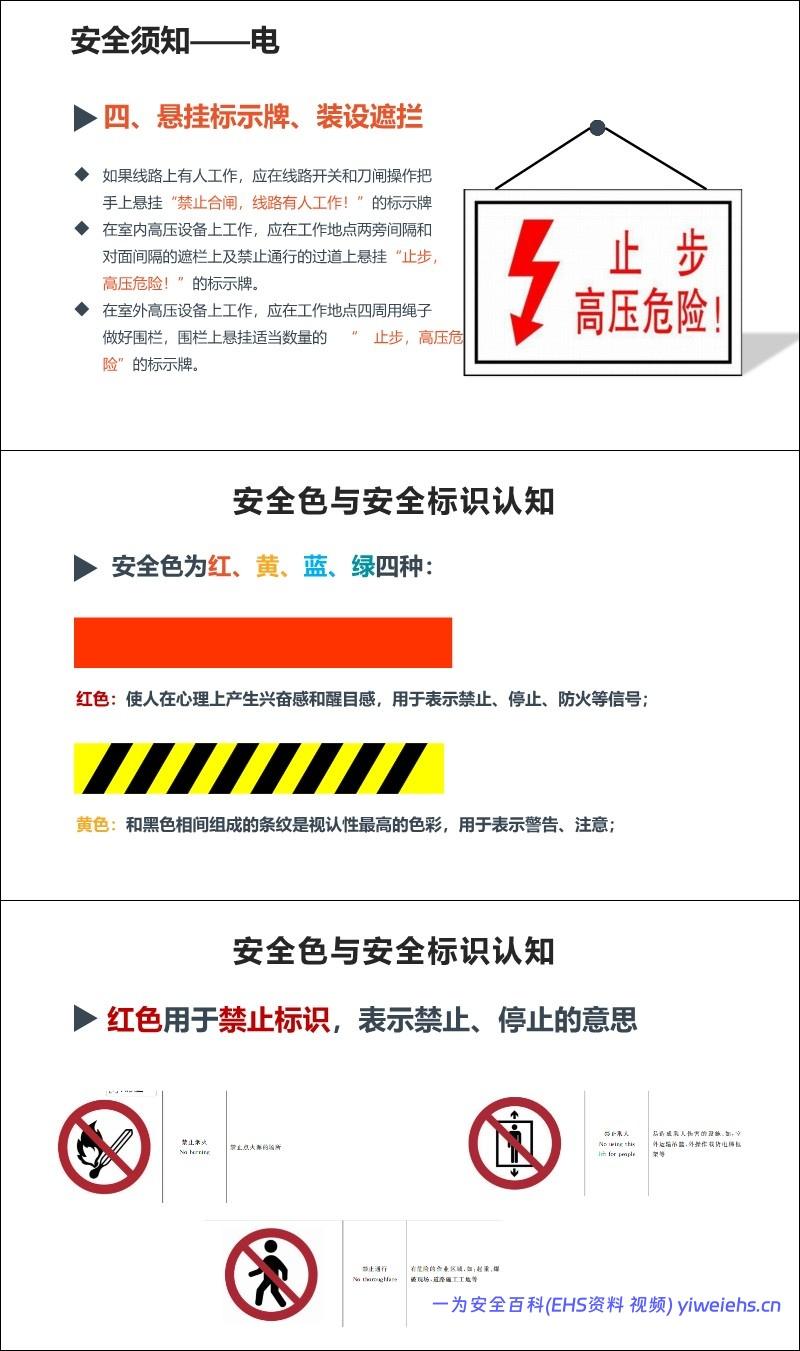 警示标志与防护用品: 介绍了红黄蓝绿四种安全色的含义,以及头部、眼面、呼吸等十大类劳动防护用品的正确佩戴。