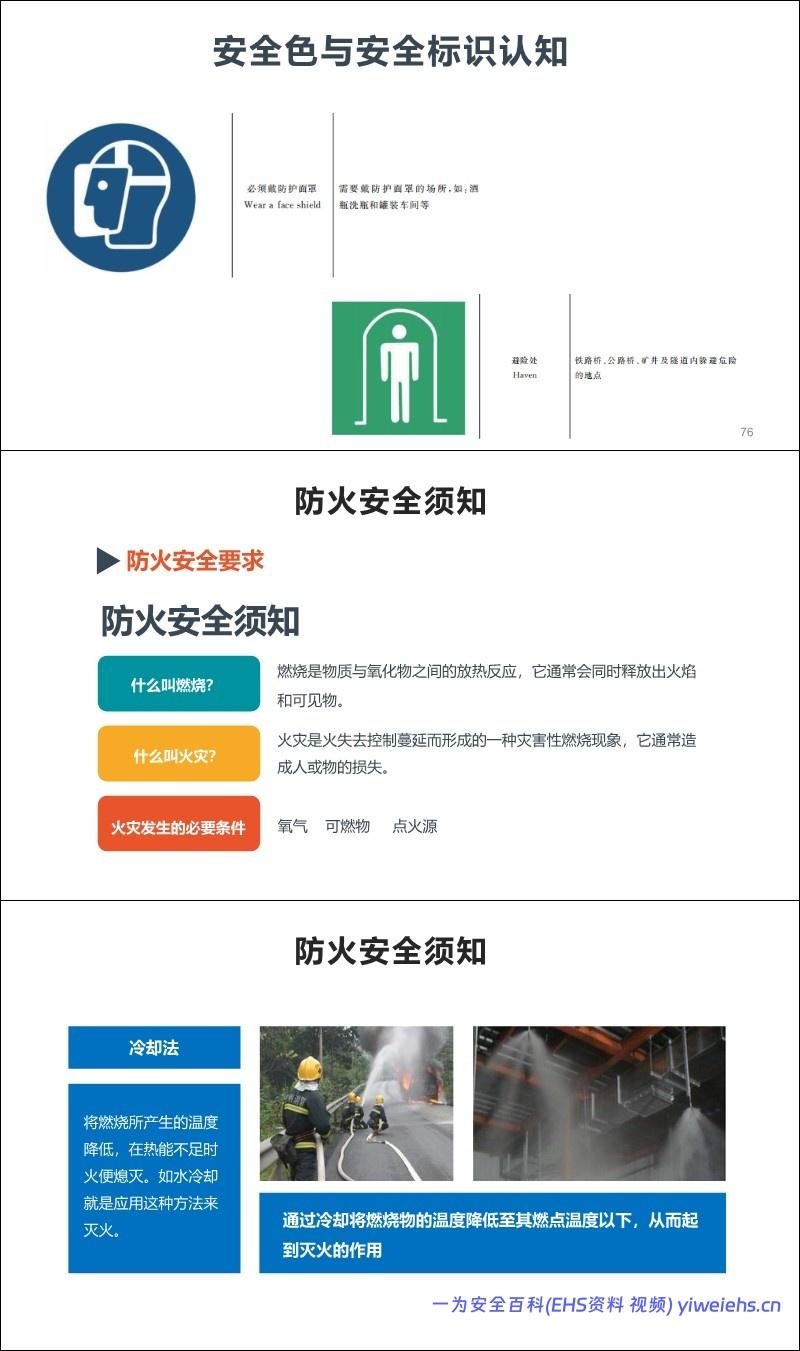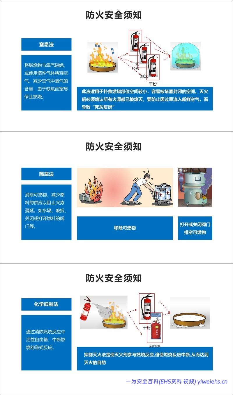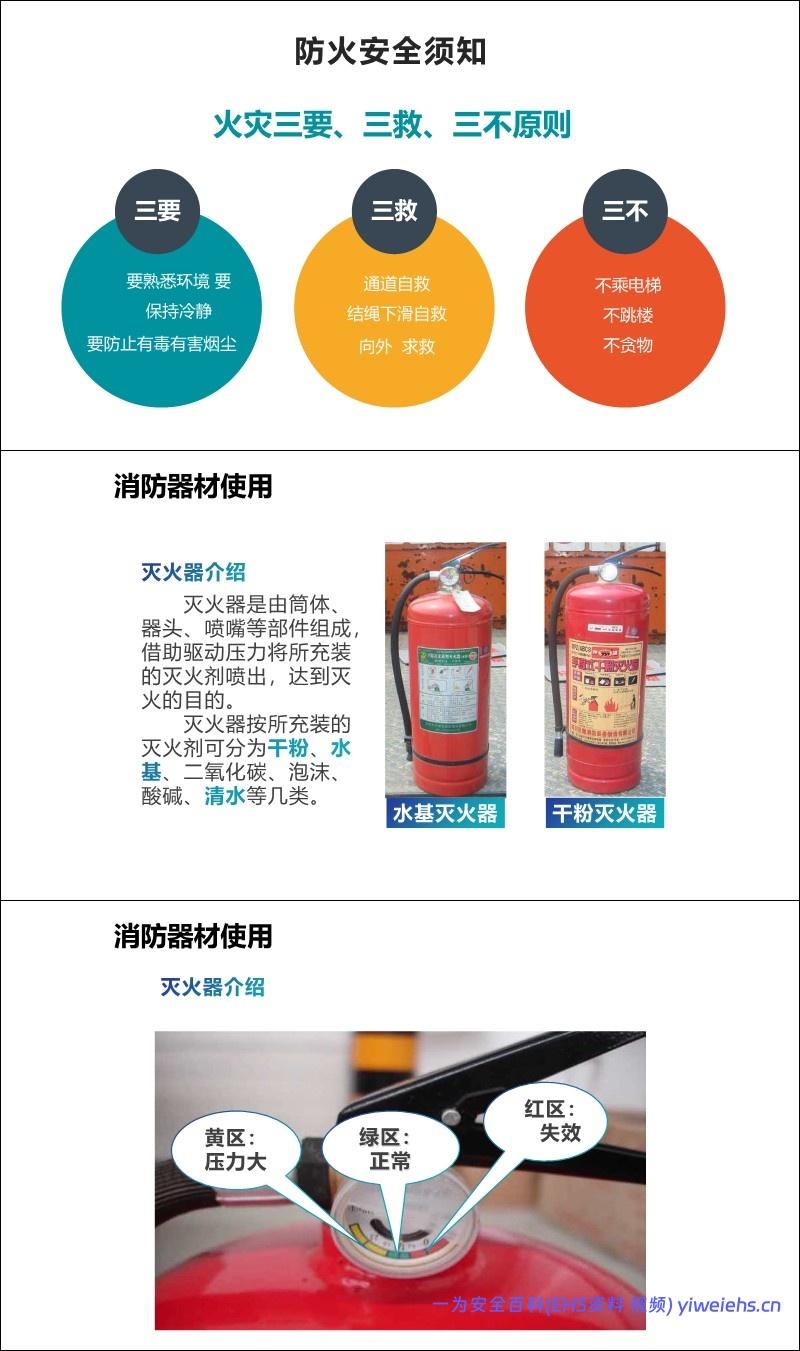 防火安全: 介绍燃烧条件、灭火方法(冷却、窒息、隔离、抑制)、灭火器使用及火灾逃生“三要三救三不”。