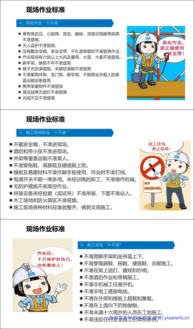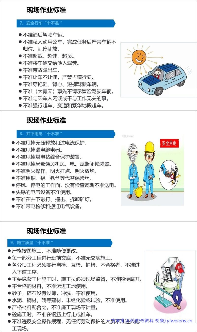 行业“十不准”: 涵盖了电焊气割、起重作业、电气安全、高处作业、施工现场、安全行车、井下用电等多个领域的具体禁令。