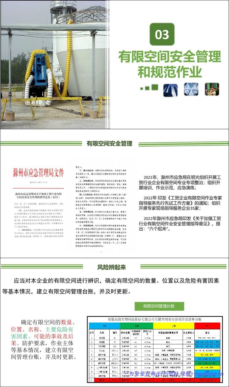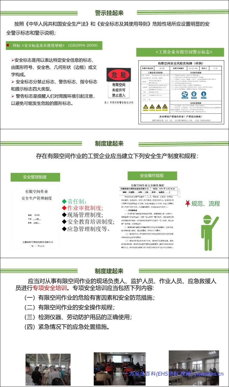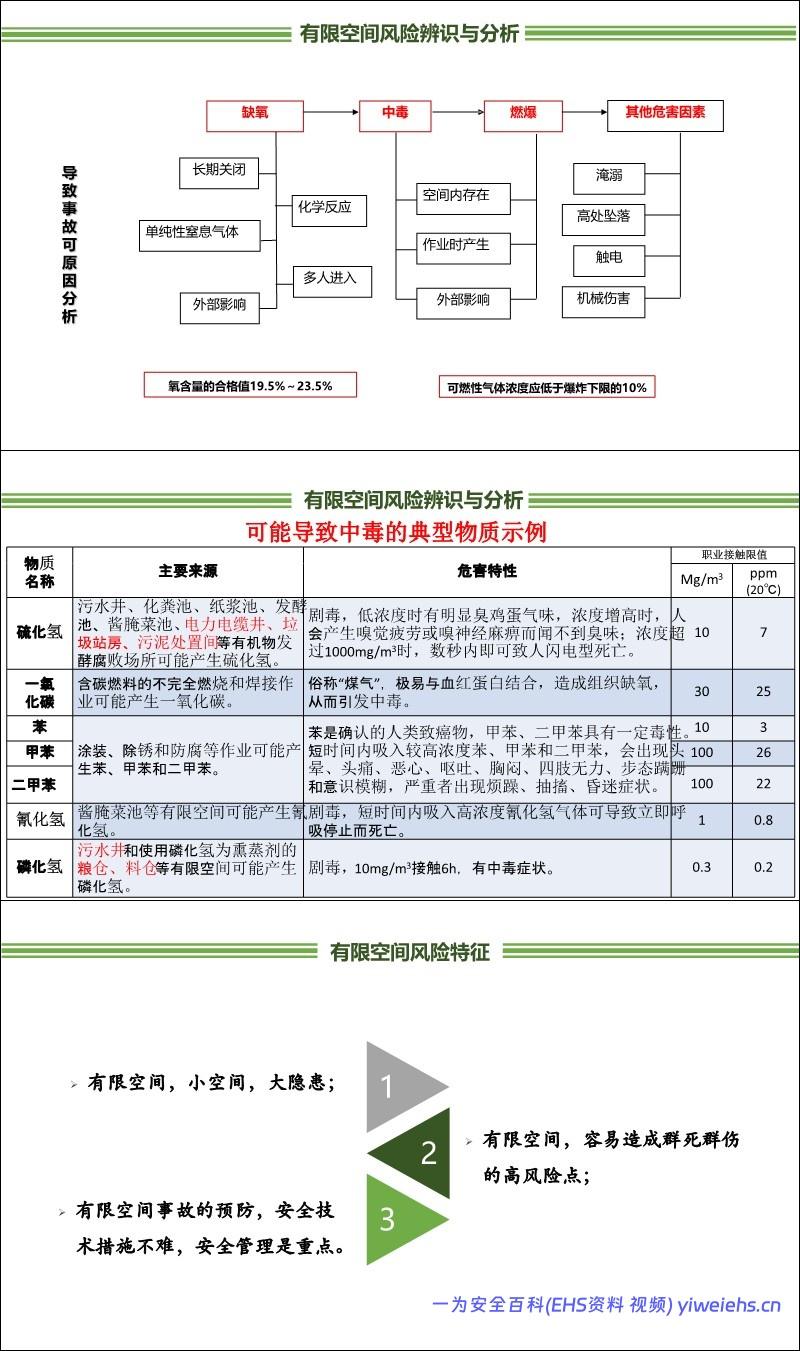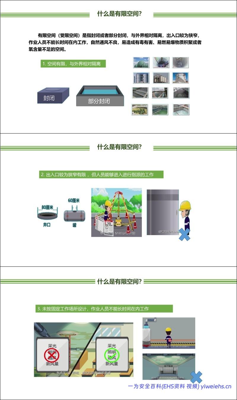 定义与特征:有限空间是指封闭或部分封闭、与外界相对隔离、出入口狭窄、非固定工作场所设计、自然通风不良,易造成有毒有害、易燃易爆物质积聚或氧含量不足的空间。