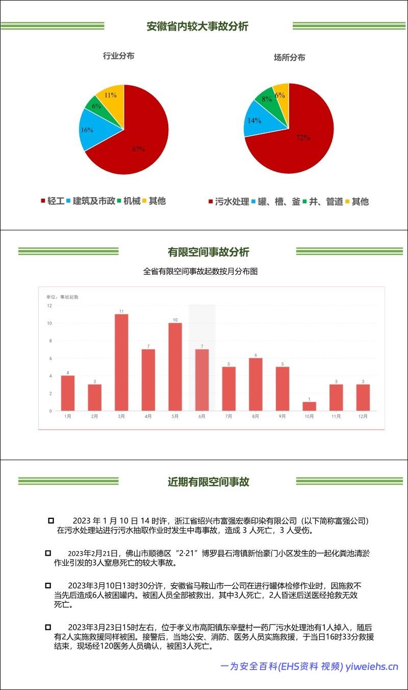 数据统计:分析了全国及安徽省近年来的工贸企业有限空间较大事故。数据显示,3-9月为事故高发期,硫化氢中毒占比最高(约46%),盲目施救导致伤亡扩大的情况普遍。