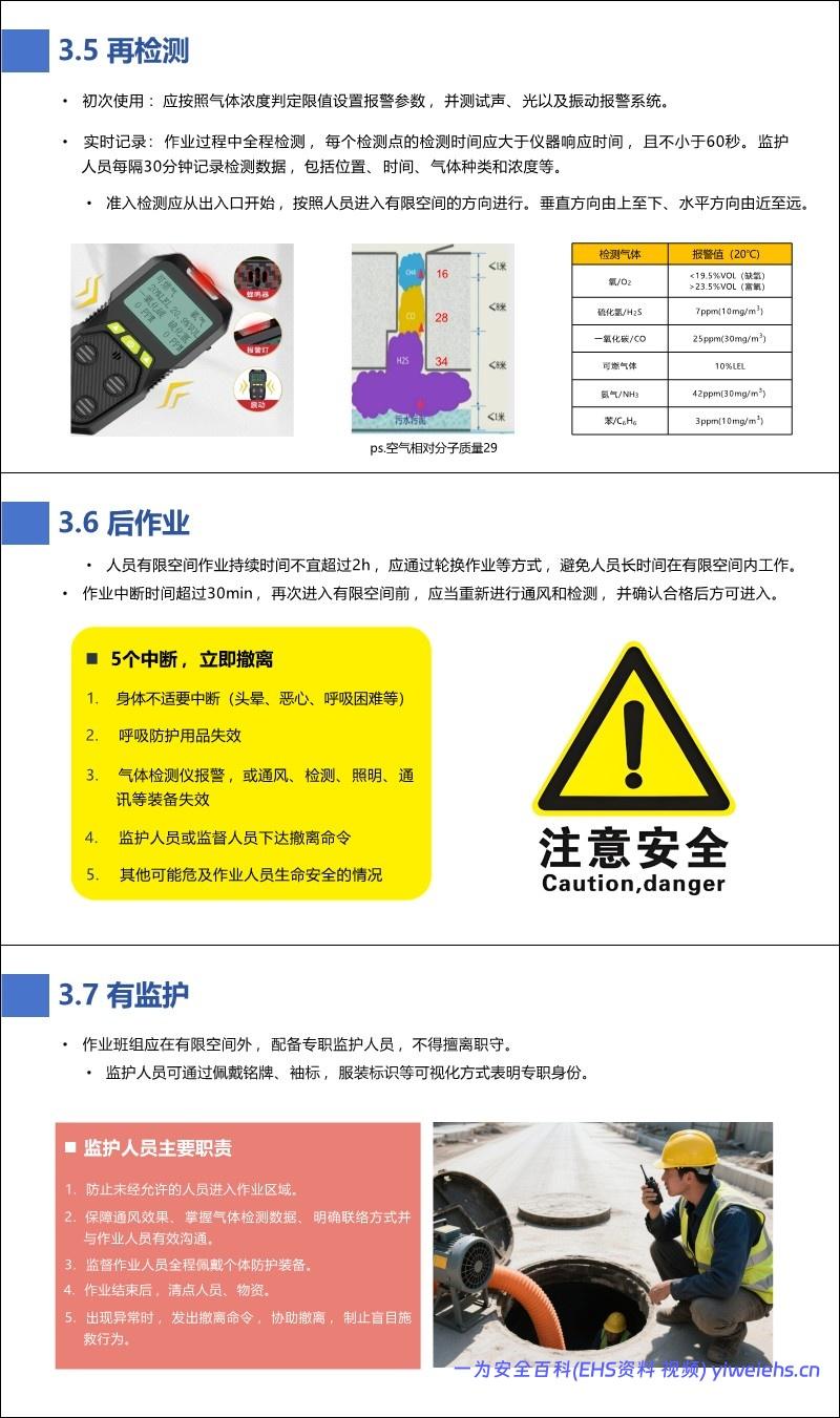 后作业: 确认合格后方可进入。单次作业时间不宜超过2小时,中断超过30分钟需重新通风检测。出现身体不适、设备报警等5种情况立即撤离。