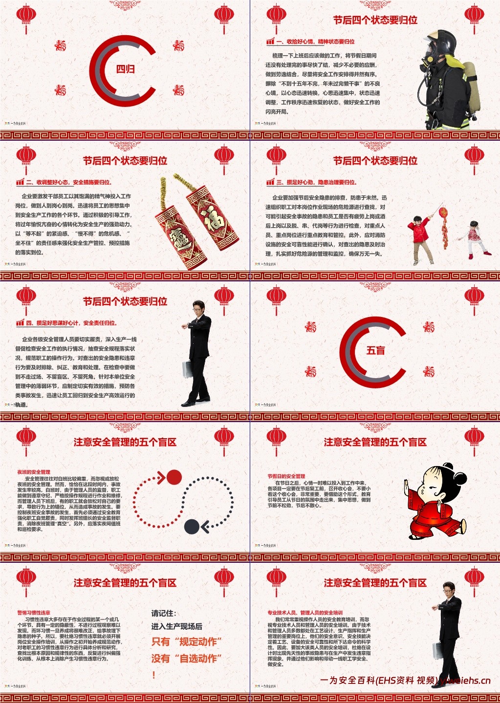 八危:明确节后复工易出现的八大危险作业,包括违章操作、安全装置失效、使用不安全设备、手代替工具操作、冒险进入危险场所、攀坐不安全位置、不佩戴劳保用品、不安全装束。