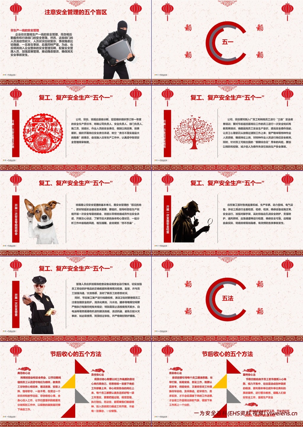五法:节后收心的五个方法,包括典范收心法(以值班员工为榜样)、责任收心法(以责任心约束自身)、务实收心法(统筹安排工作)、案例收心法(用事故案例警示)、工具平台教育法(利用安全工具或平台培训)。