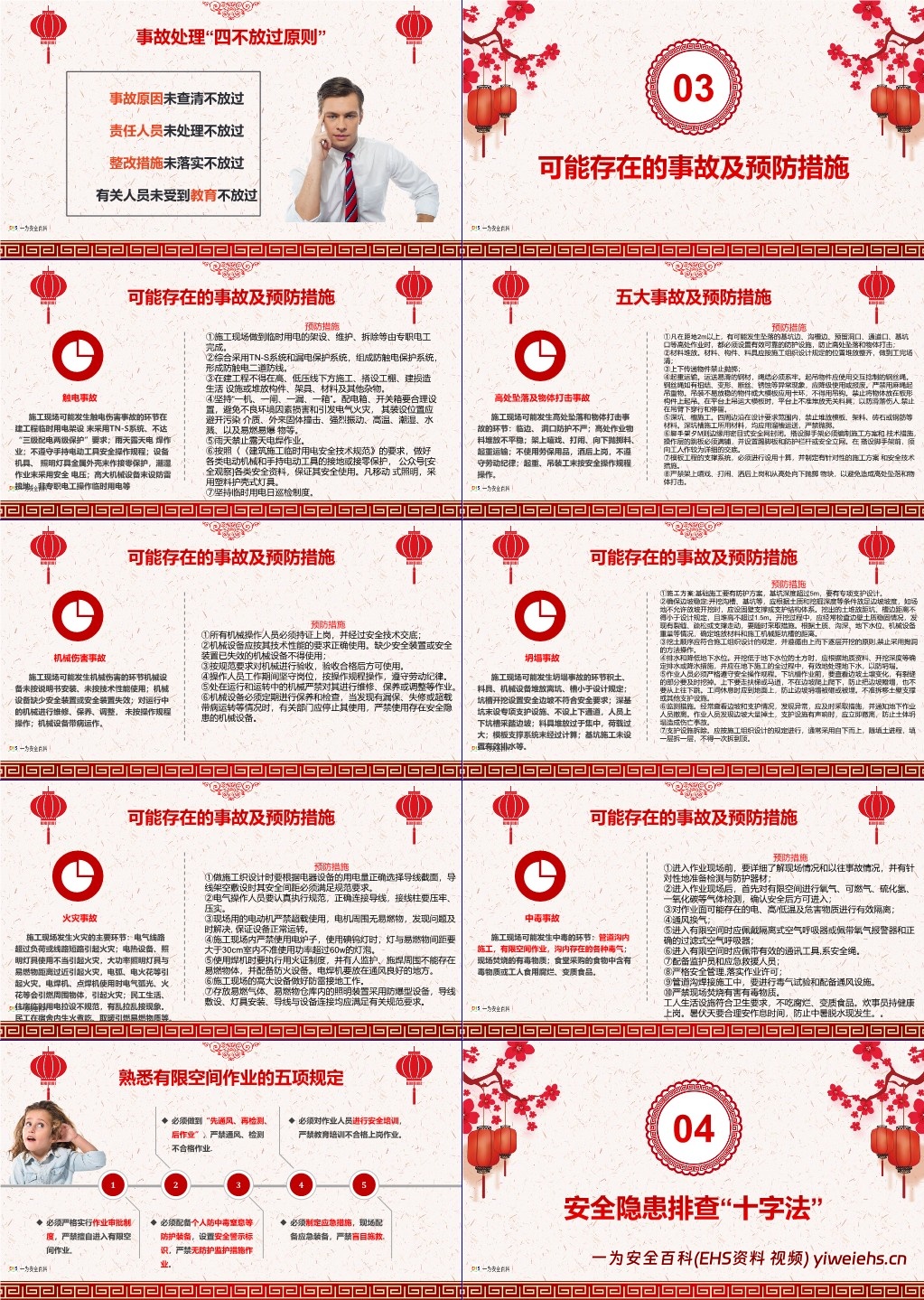 列举触电、高处坠落及物体打击、机械伤害、坍塌、火灾、中毒六类常见事故的发生环节(如触电多因临时用电不规范,火灾多因线路超载或违规使用明火等),并针对每类事故提出具体预防措施(如触电需由专职电工操作、采用 TN-S 系统等)。