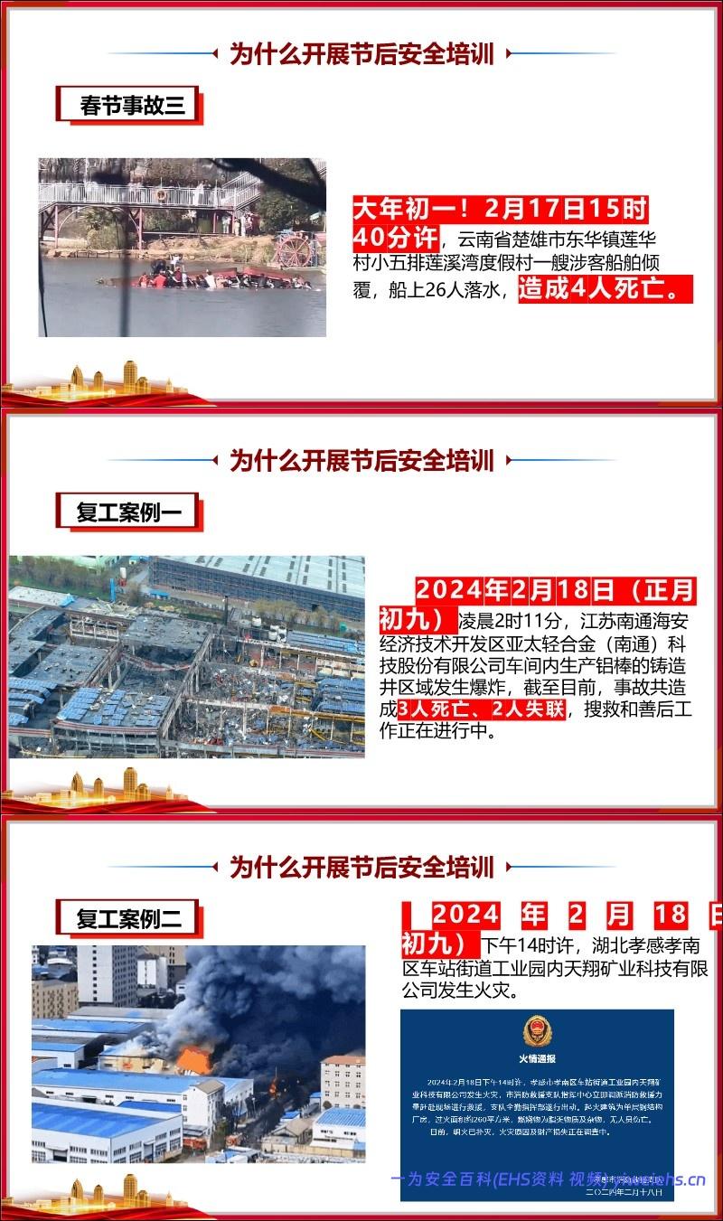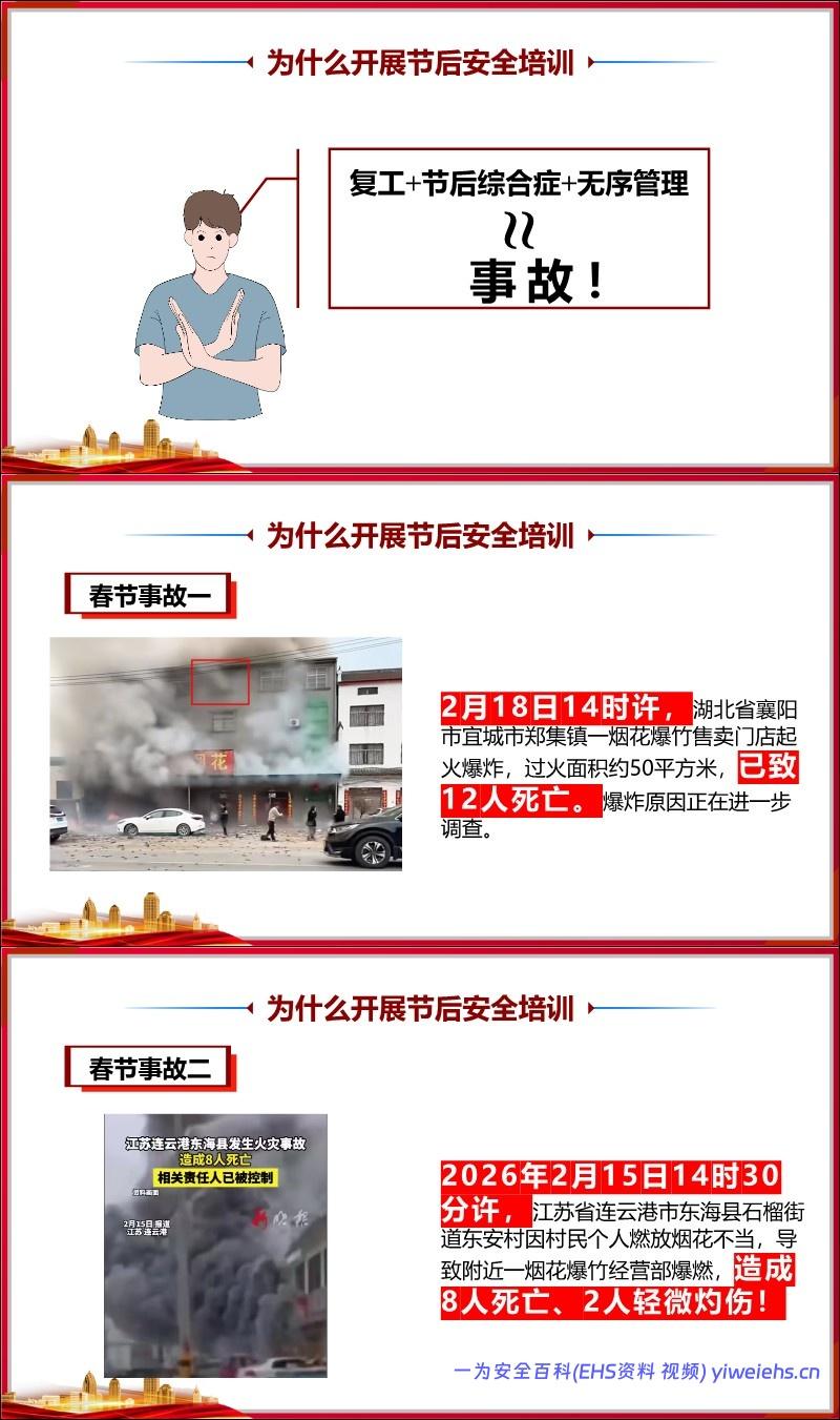 案例警示:列举了多起春节期间及复工初期发生的严重事故(如湖北襄阳烟花爆炸、江苏南通工厂爆炸、湖北孝感火灾等),造成多人伤亡,以此强调开展安全培训的紧迫性。