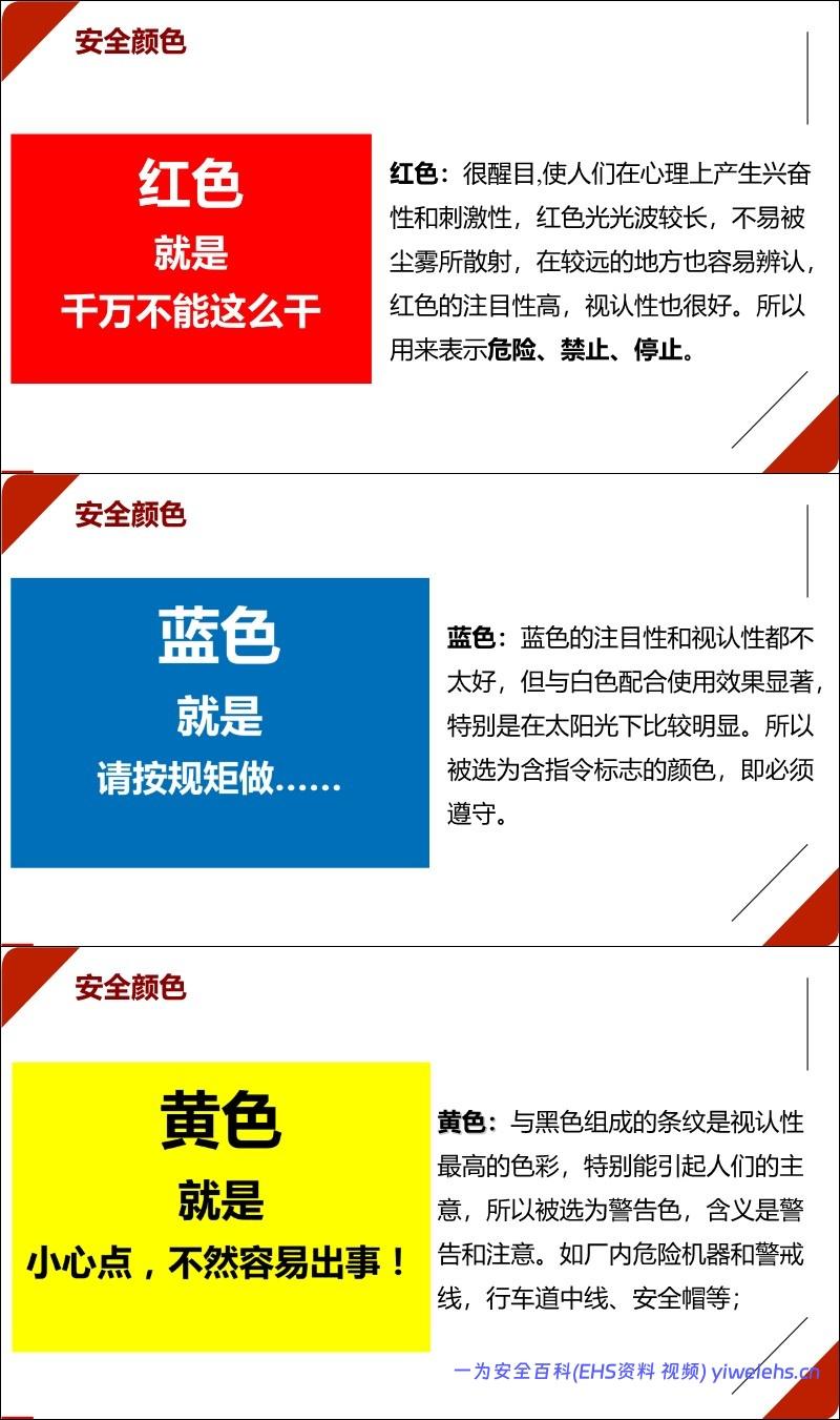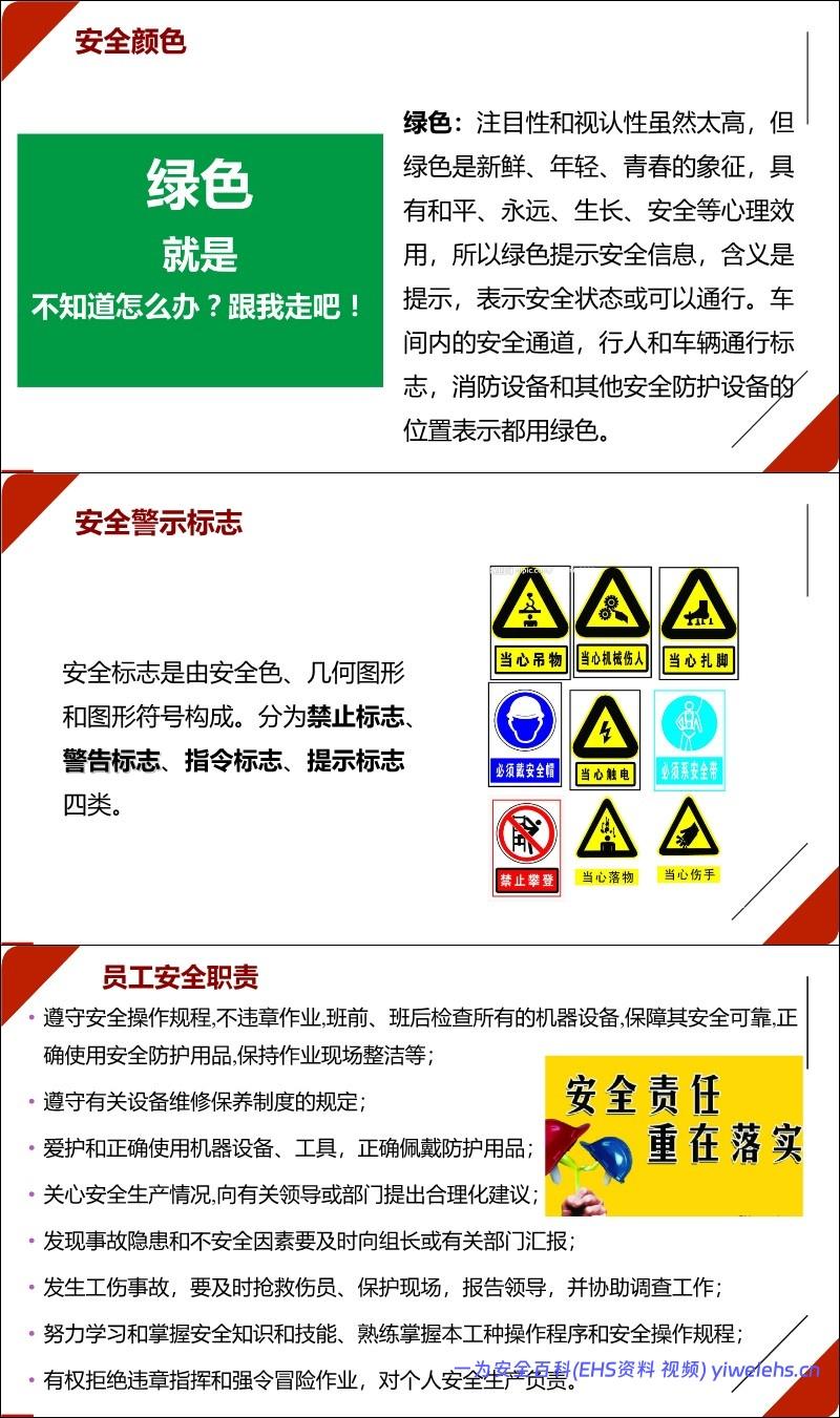 安全色与标志:介绍了红(禁止/危险)、黄(警告/注意)、蓝(指令/必须遵守)、绿(提示/安全)四种安全色及其含义,以及四类安全标志。