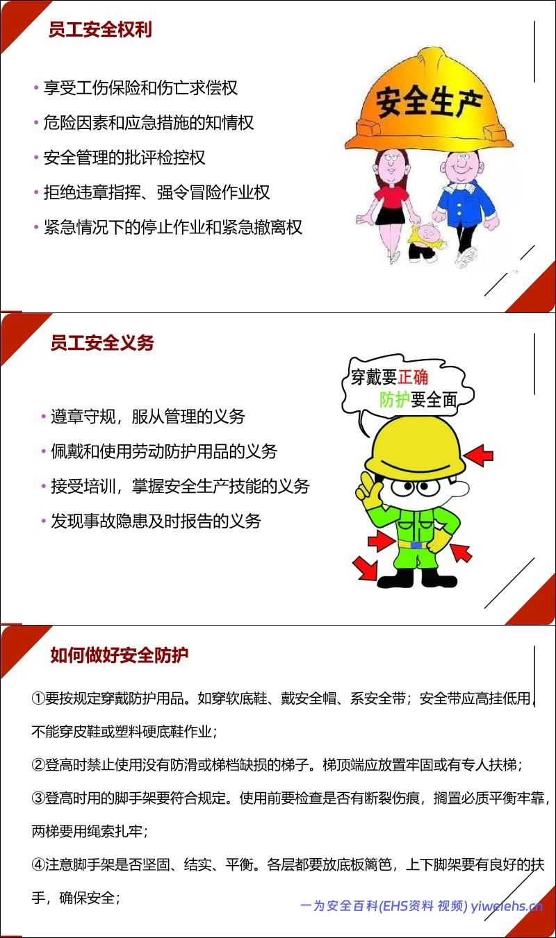 义务:遵章守规、佩戴防护用品、接受培训、报告隐患。