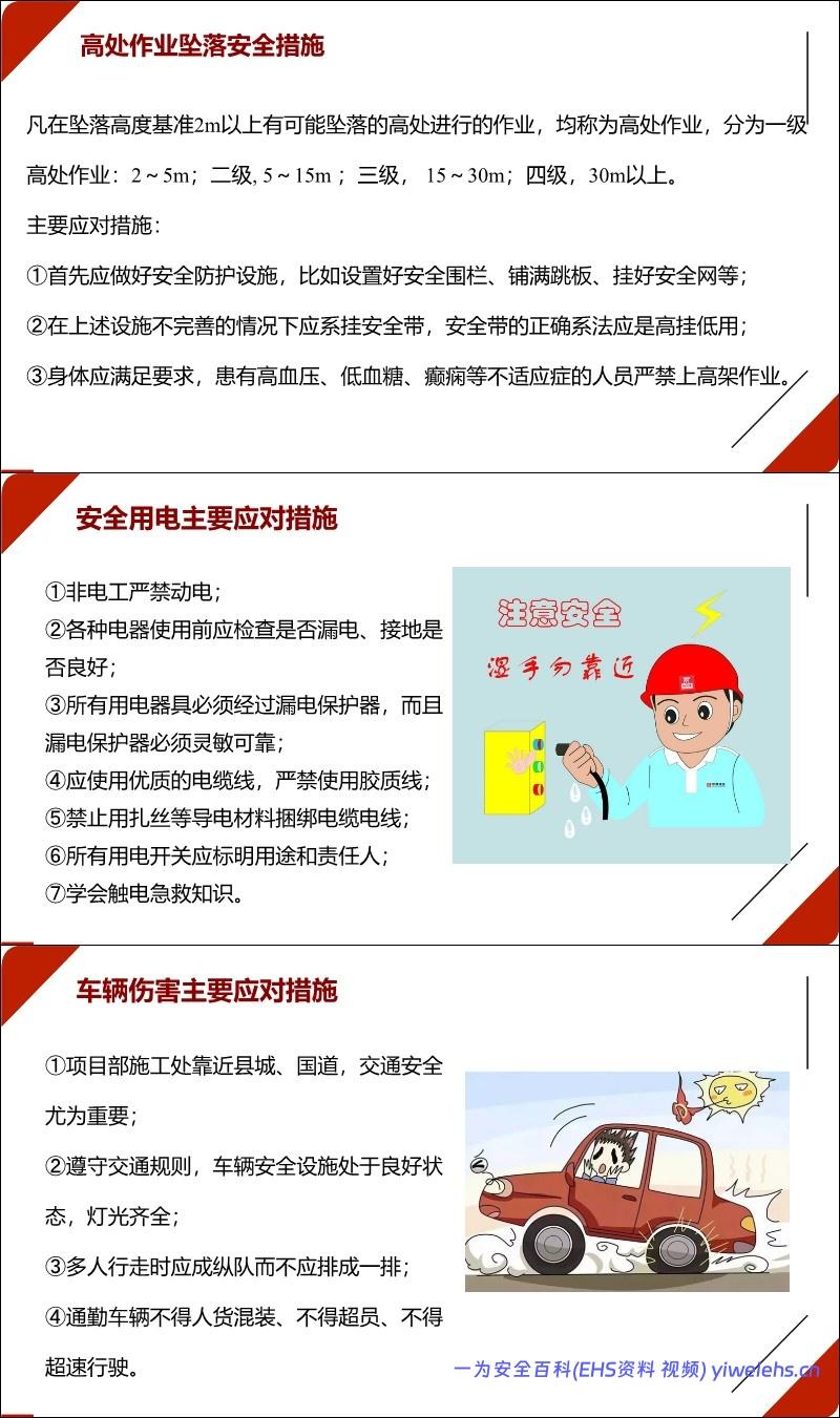 高处作业:防坠落措施(安全网、安全带高挂低用)、身体状况要求、恶劣天气禁止作业等。
