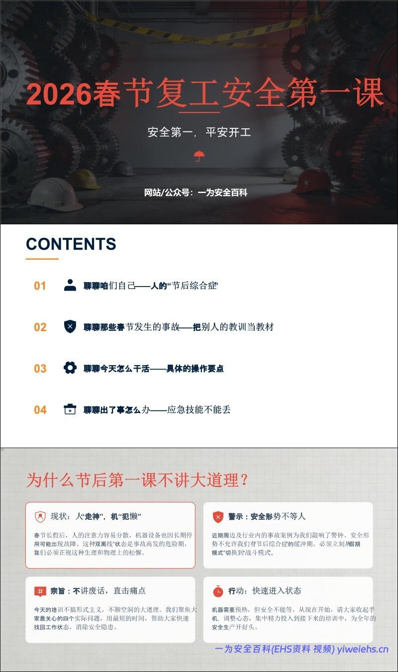【PPT+Word】2026春节后复工安全第一课讲义PPT内容介绍: