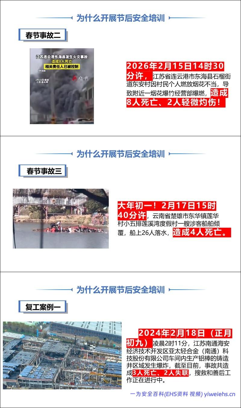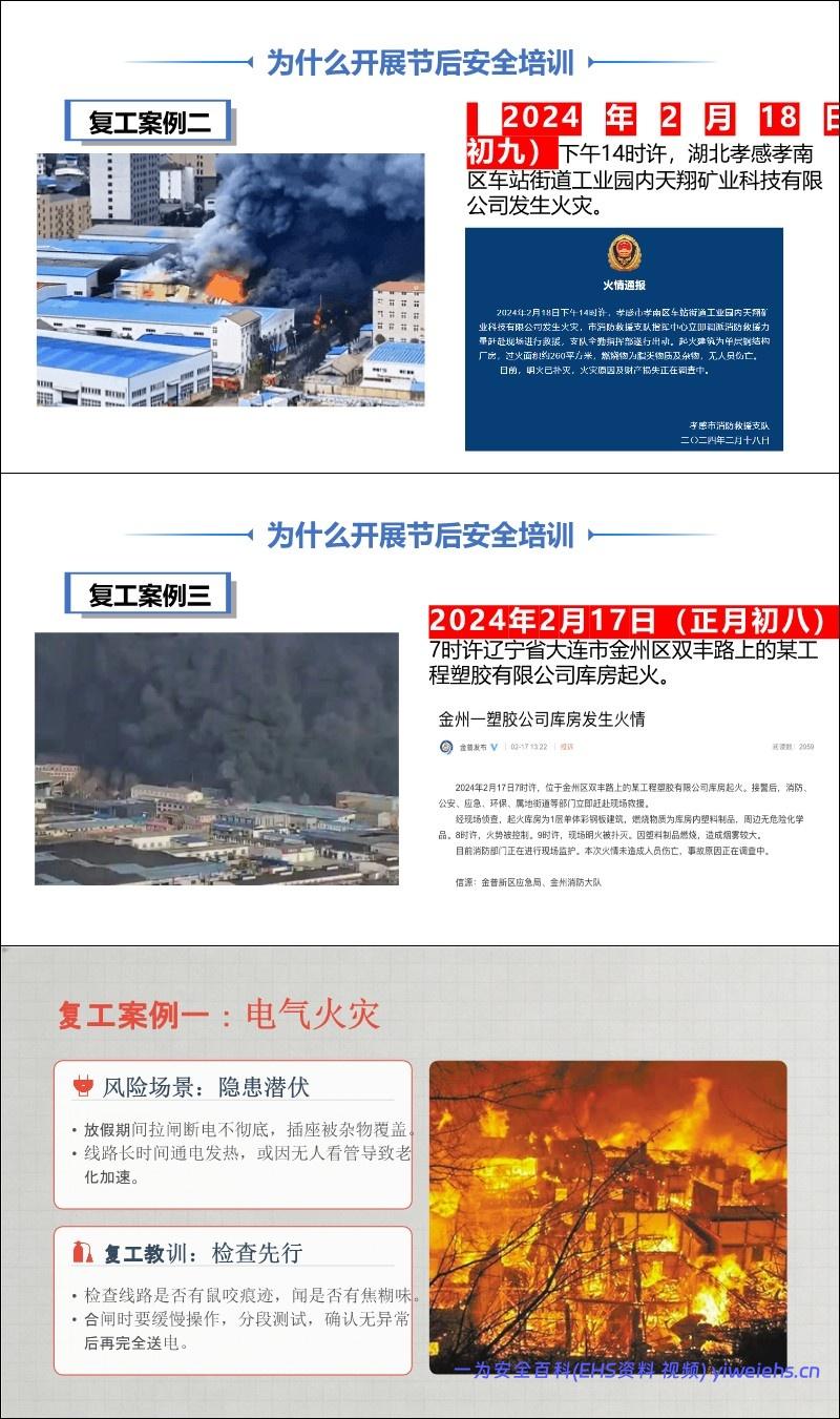 文档列举了春节期间及复工初期发生的真实事故案例,包括烟花爆竹爆炸、船舶倾覆、工厂火灾及爆炸等,造成多人伤亡。通过复盘这些案例,重点强调了三大复工风险: