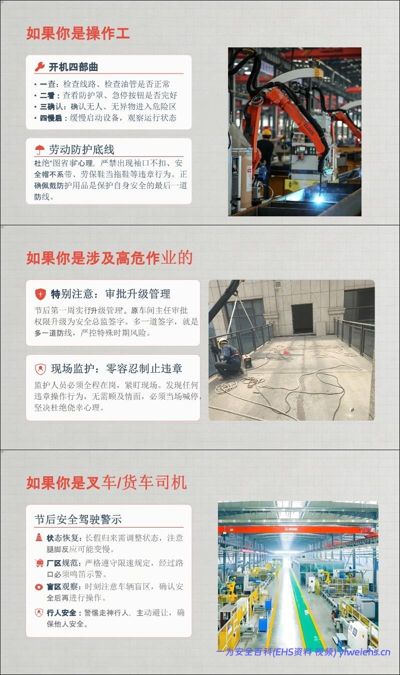 高危作业人员: 节后第一周实行“升级管理”,审批权限上收(如需安全总监签字)。监护人员必须全程在岗,对违章零容忍。