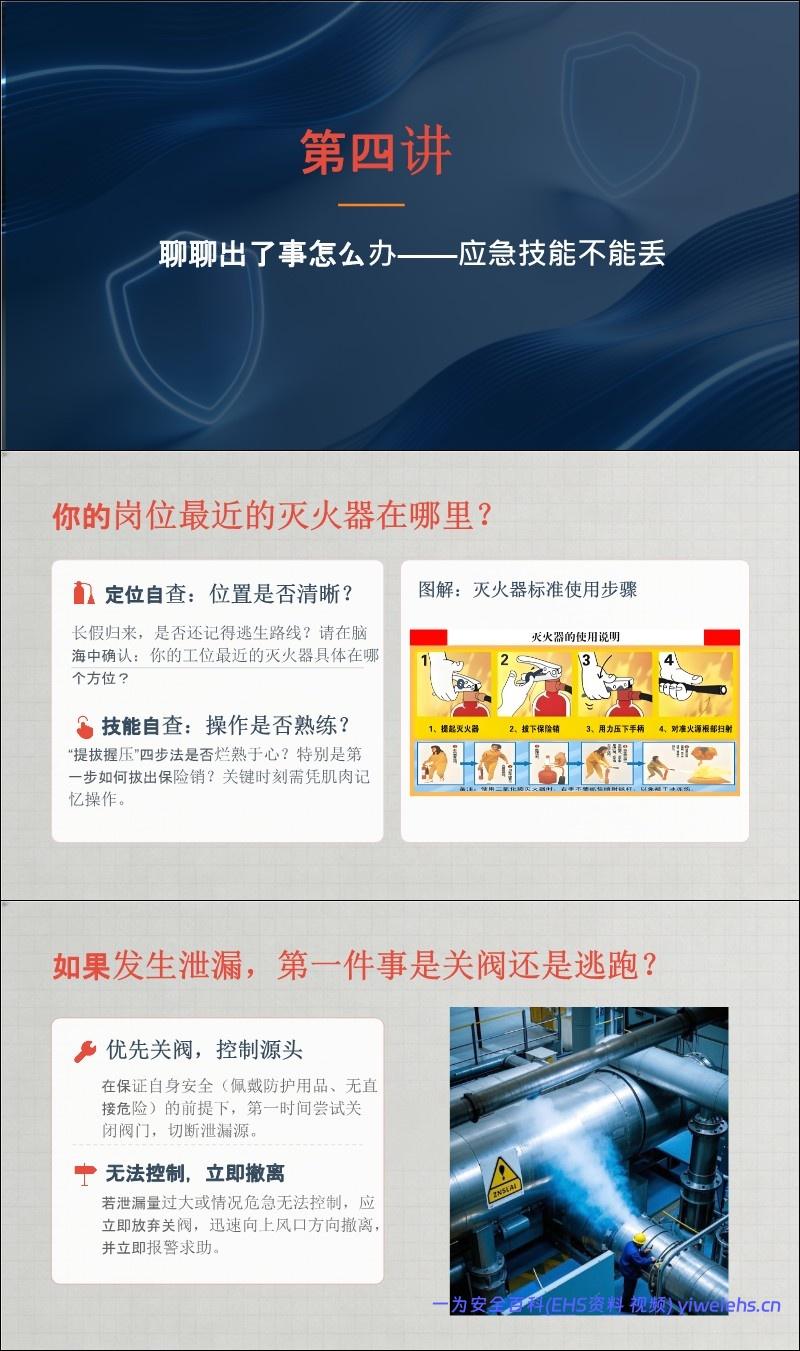 灭火器使用: 确认位置,熟练掌握“提拔握压”四步法。