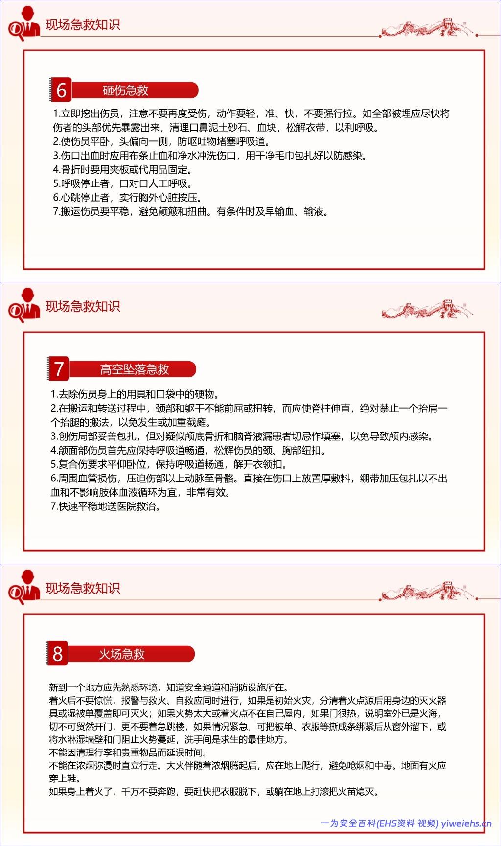 火场急救: 熟悉环境,报警自救,初期灭火,浓烟爬行,身上着火打滚,不贪恋财物。