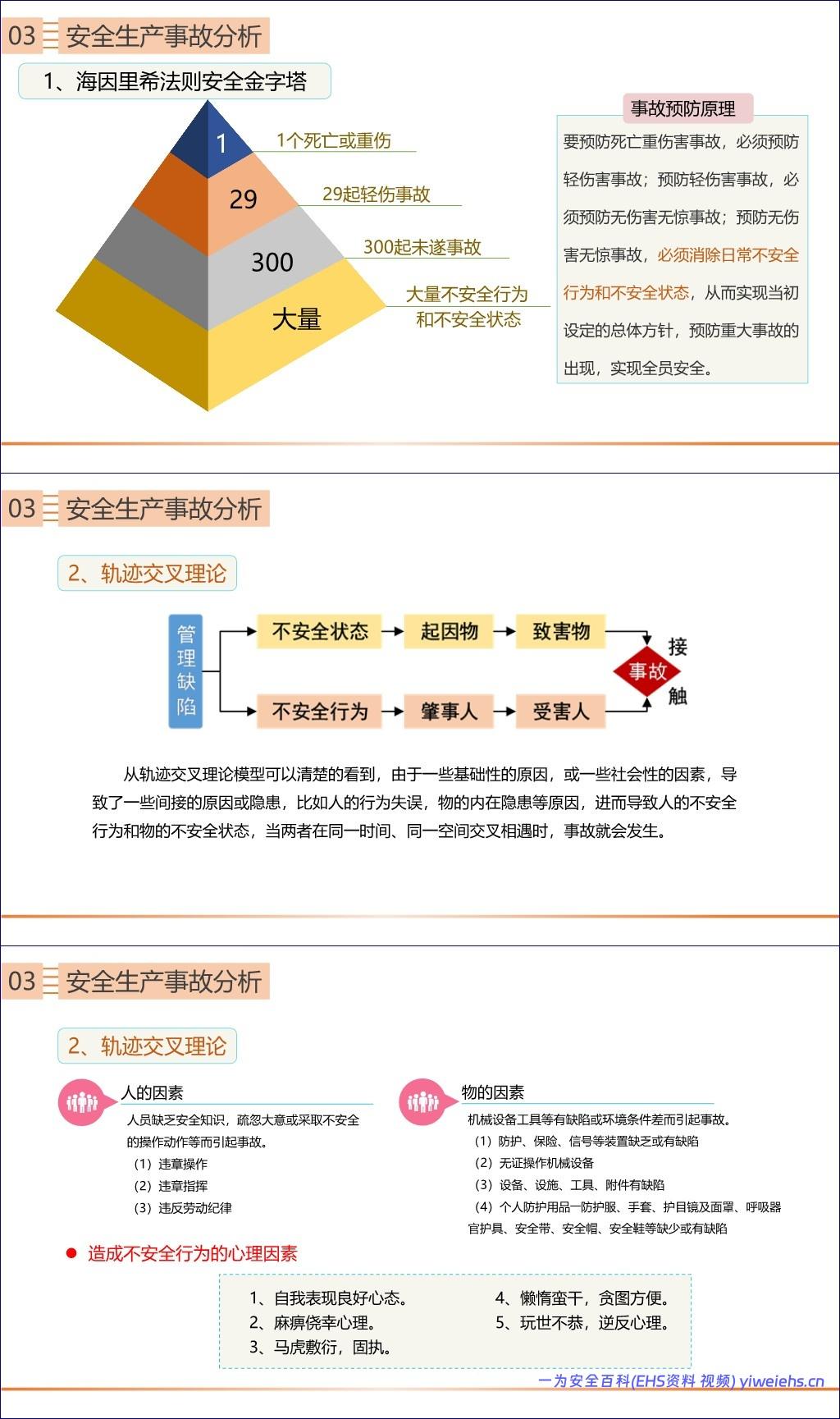理论模型:介绍了“海因里希法则”(1:29:300比例,强调消除不安全行为和状态)和“轨迹交叉理论”(人的不安全行为与物的不安全状态在时空交叉导致事故)。