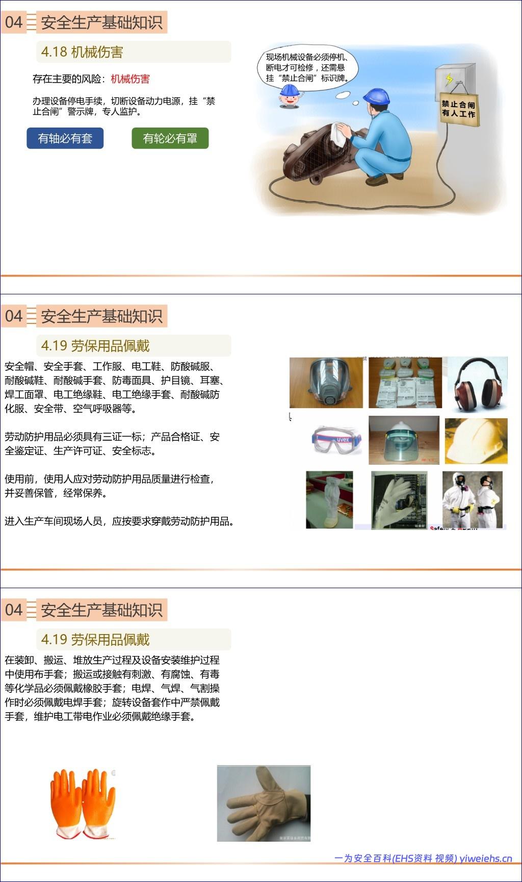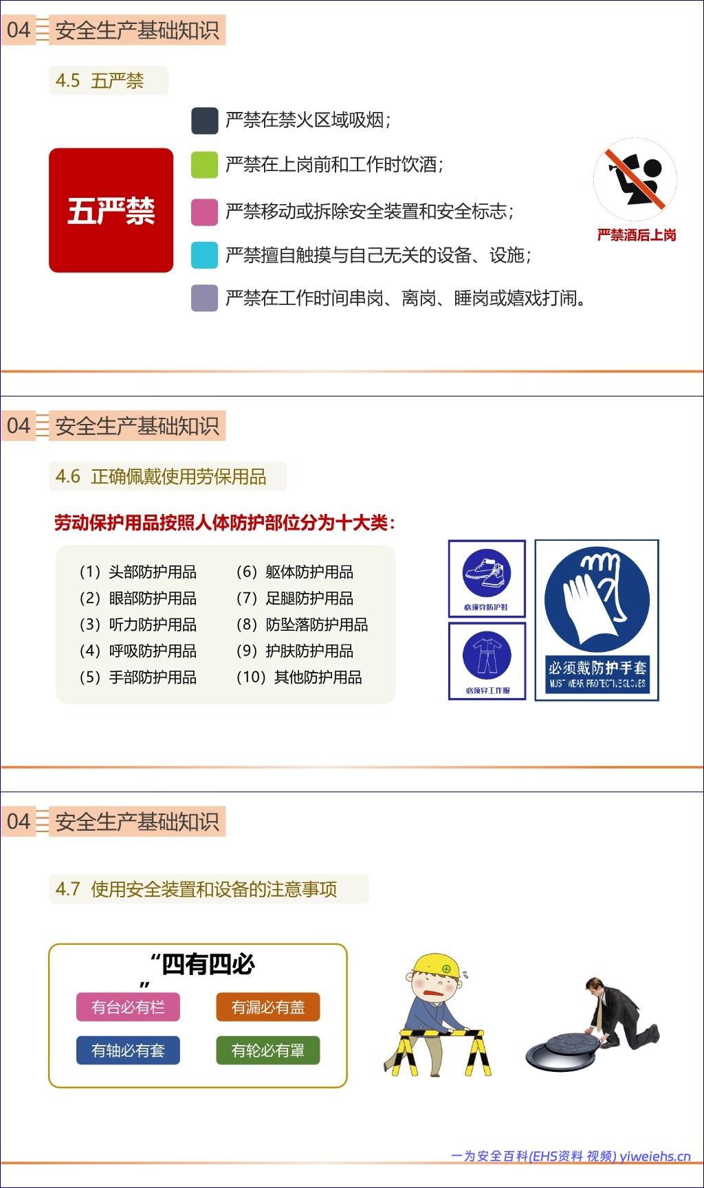 劳保用品:介绍了十大类防护用品,强调“三证一标”,并展示了安全帽、安全带等的正确佩戴方式。