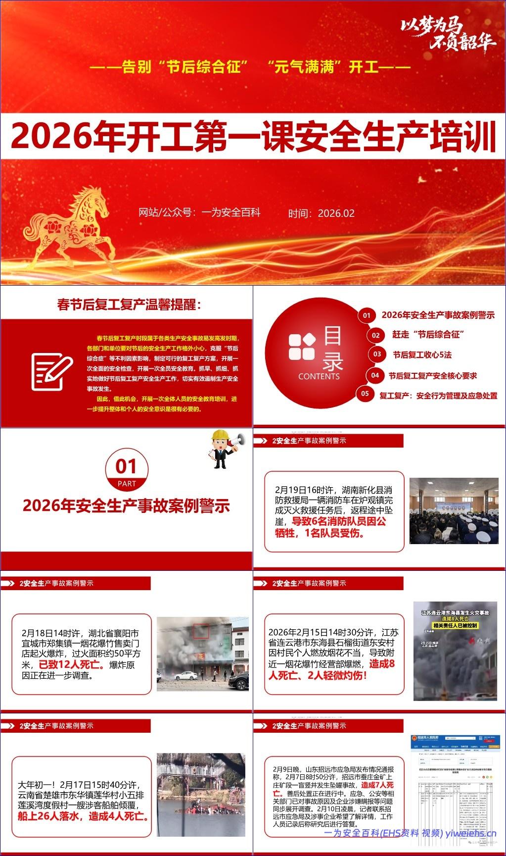 这篇文档是一份题为“2026年开工第一课!全员学习(含最新事故案例)”的安全生产培训PPT,旨在帮助员工告别“节后综合征”,安全、有序地复工复产。主要内容涵盖以下几个方面: